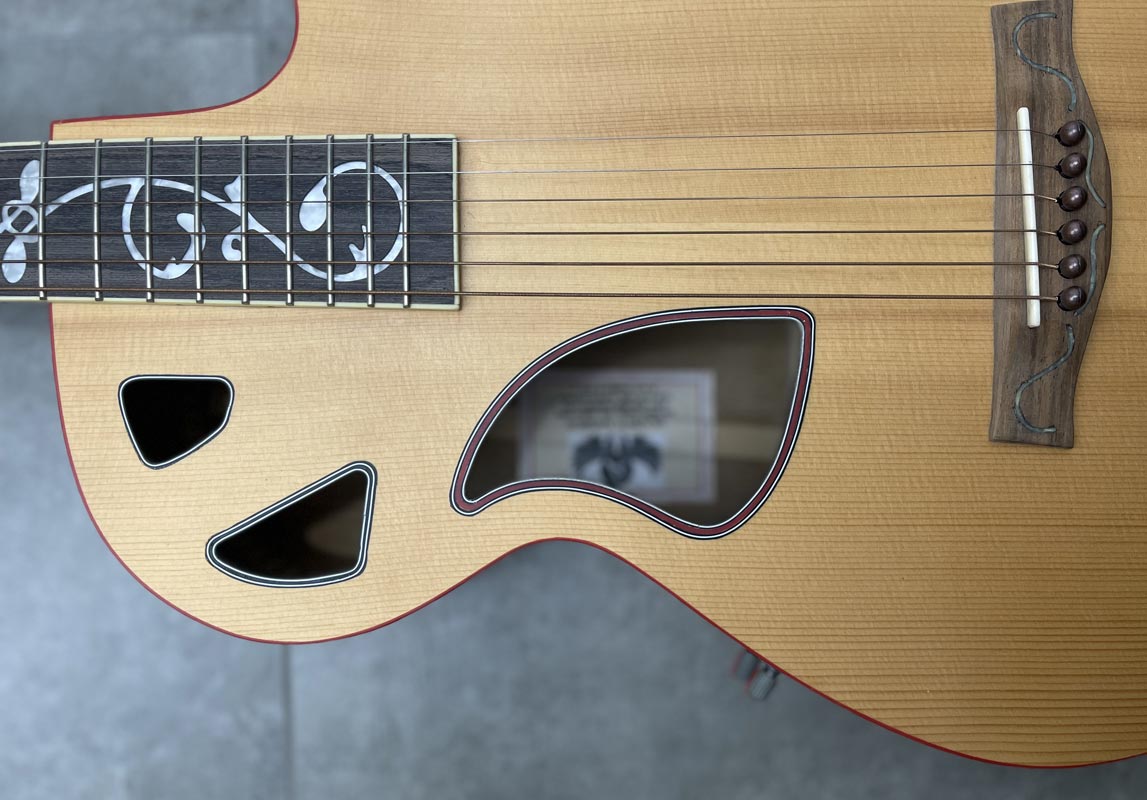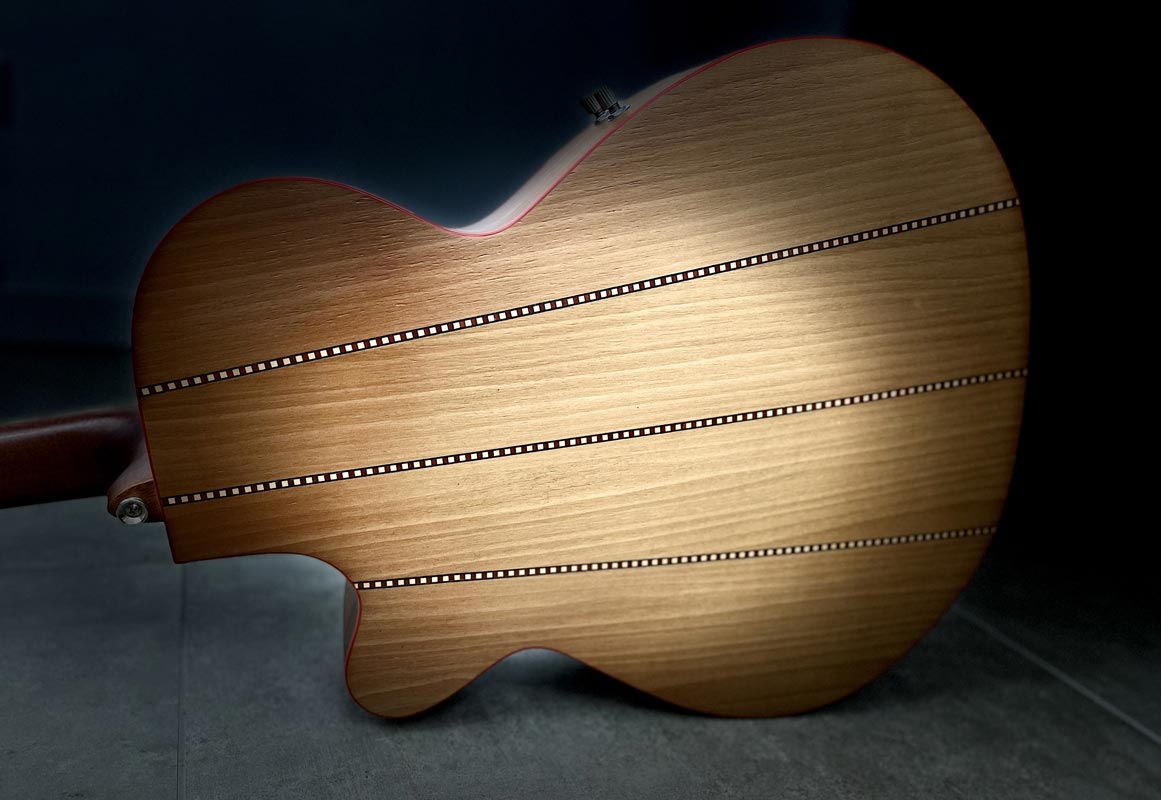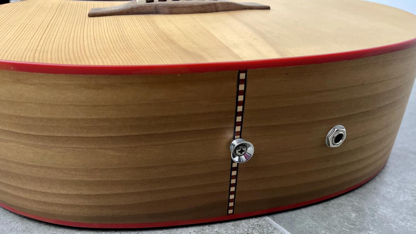 Sagoma jumbo con tavola in abete val di Fiemme Fondo fasce in ulivo Collo in acero americano Tastiera in ebano Ponte mobile con cordiera Capotasto in osso Finiture Gold Elettrificata piezo + microfono con effetti corporati Tasti medium jumbo Finitura semilucida Cassa armonica 12 cm al collo 12 cm al tacco