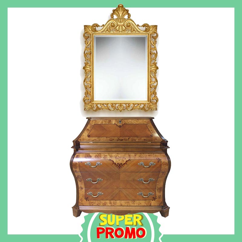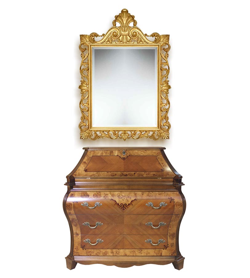 La grande singolarità del mobile è valorizzata e completata da una spettacolare specchiera intagliata e rifinita in foglia oro patinato.