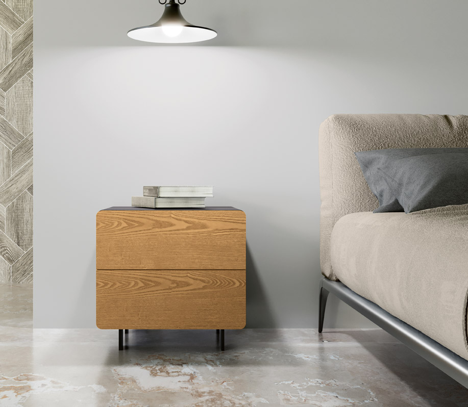 Comodino dalla linea geometrica e pulita con due cassetti, per una camera da letto moderna e contemporanea.
