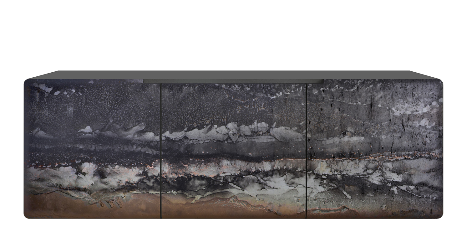 Sulla parte anteriore del mobile, 3 splendide ante presentano un design creato dalla fusione in resina che rende ogni pezzo unico.