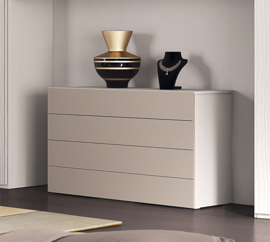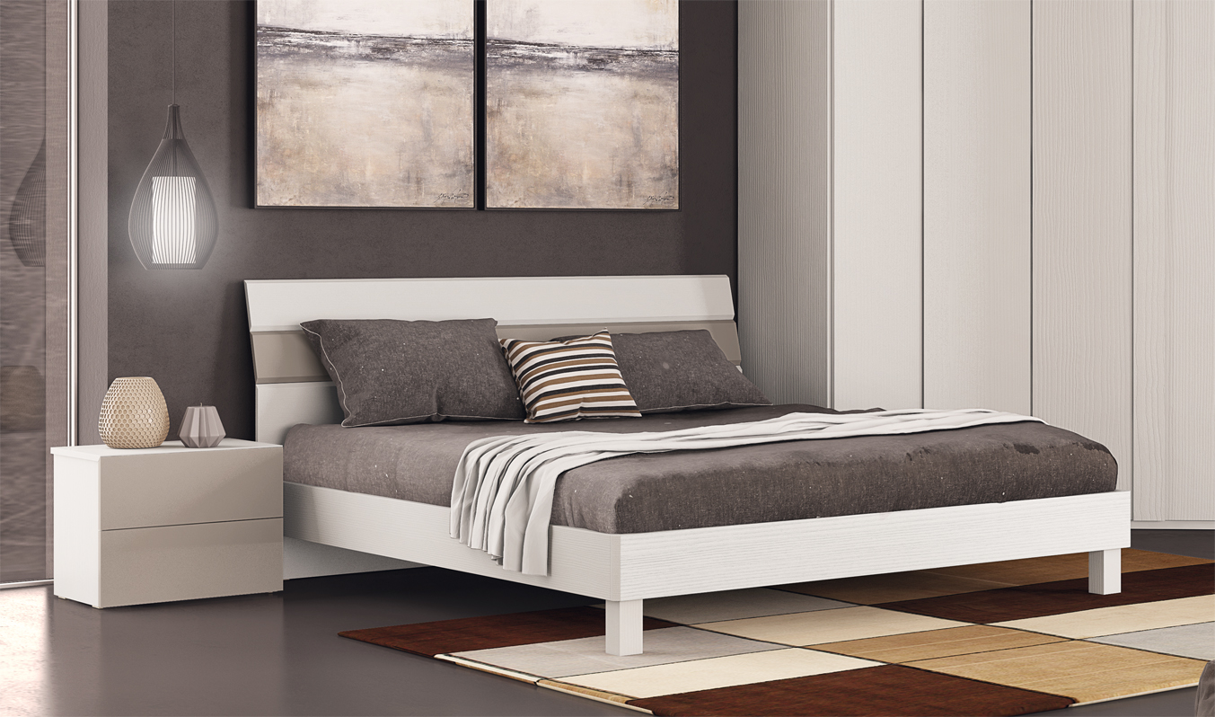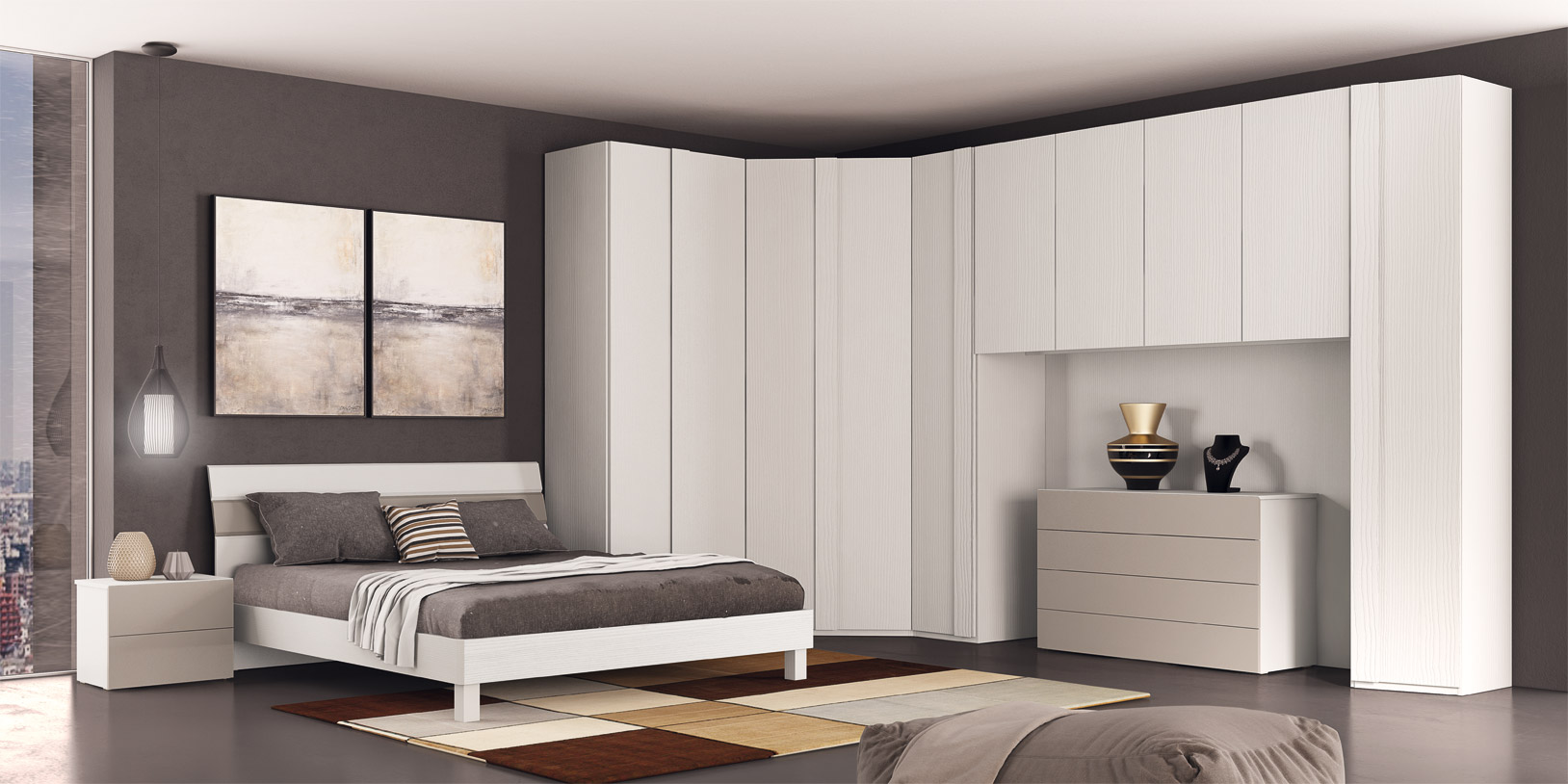 Composta da: armadio angolare con ponte, comò con quattro cassetti, comodino due cassetti e letto. Qui presentati in finitura in larice bianco e tortora.