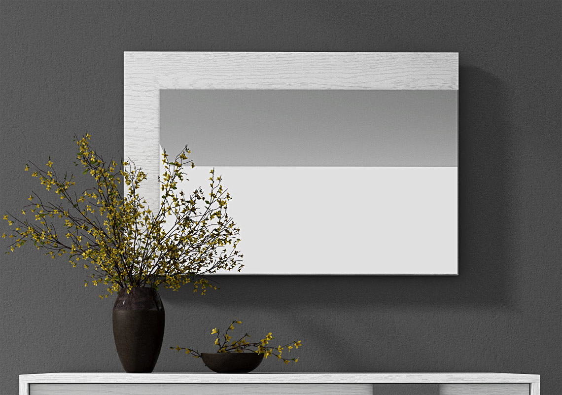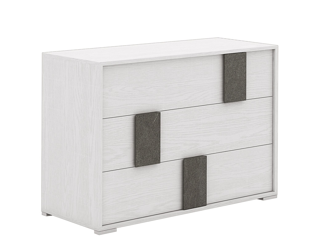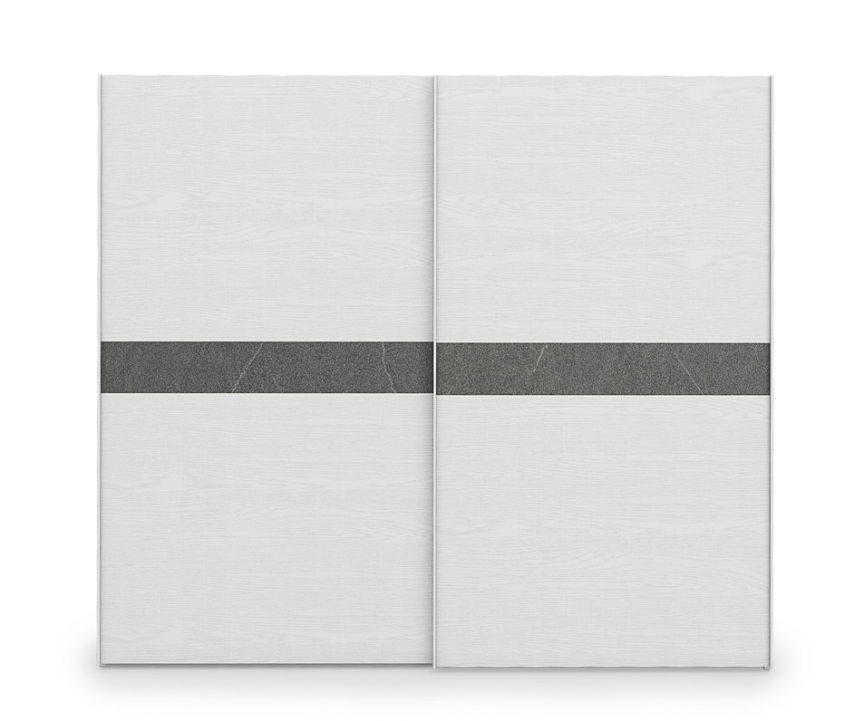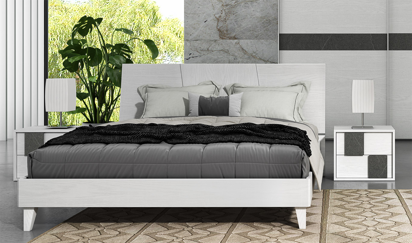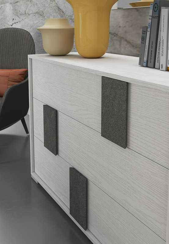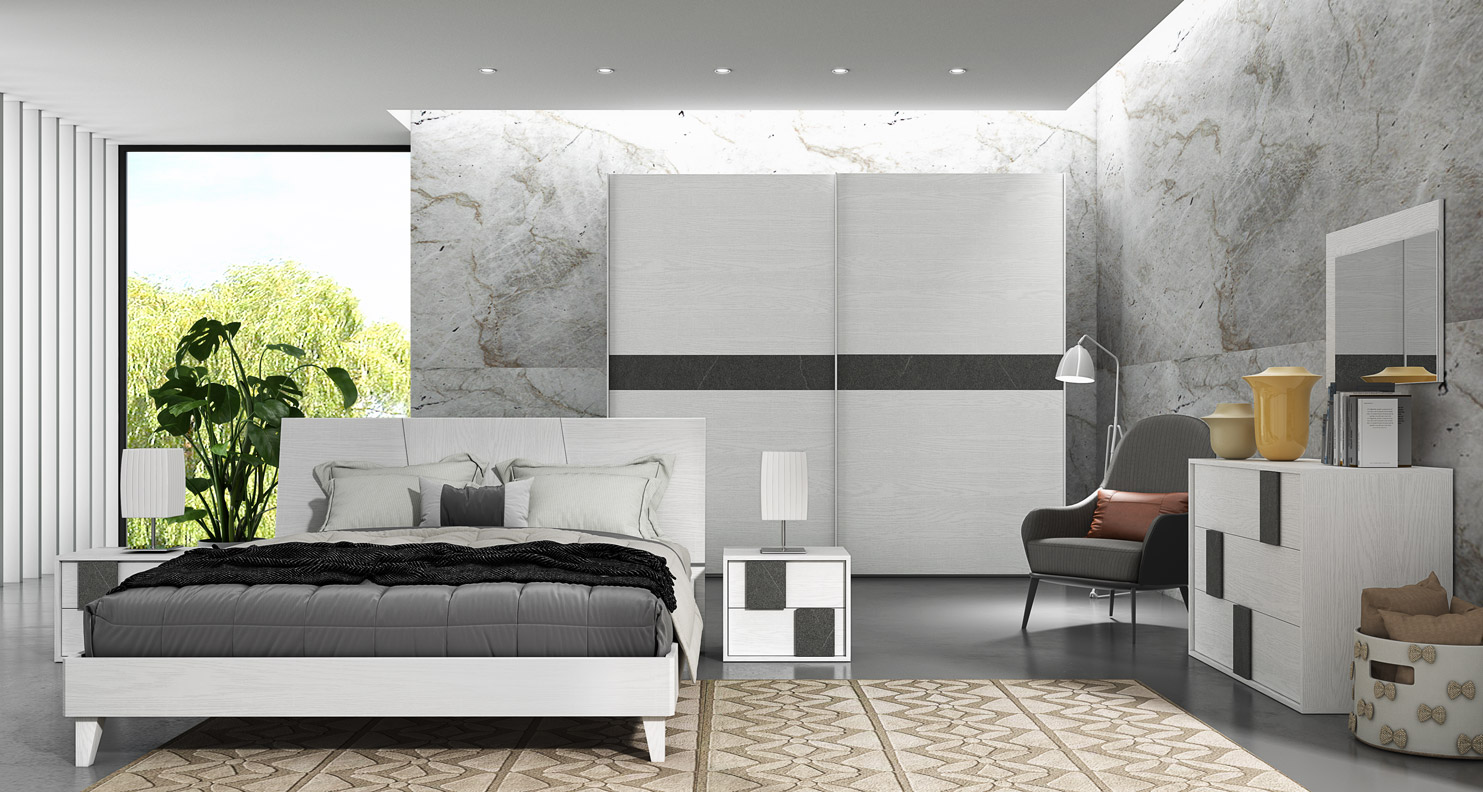 Composta da: armadio 2 ante scorrevoli, comò con tre cassetti, 2 comodini con due cassetti, letto e specchiera. Qui presentati in finitura frassino gesso e pietra.