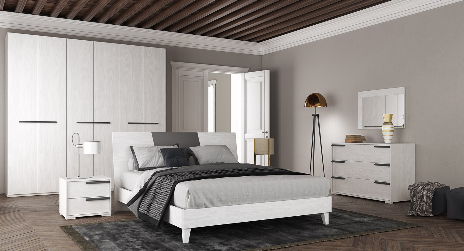 Composta da: armadio 6 ante battenti, comò con tre cassetti, 2 comodini con due cassetti, letto imbottito e specchiera. Qui presentati in finitura frassino gesso e grigio scuro.