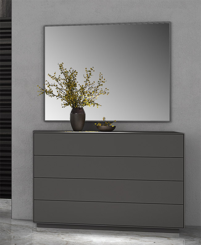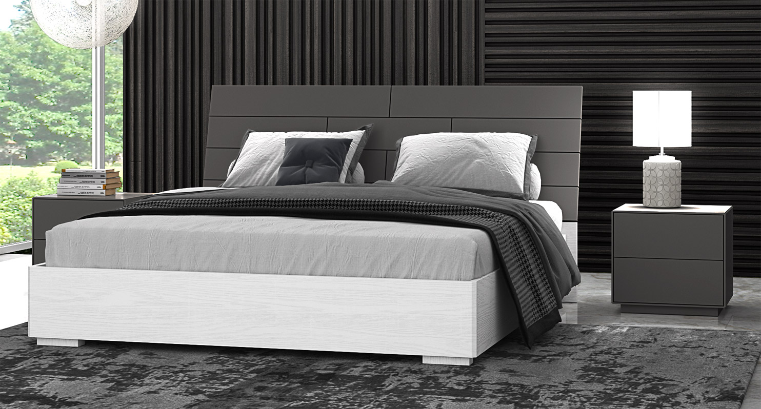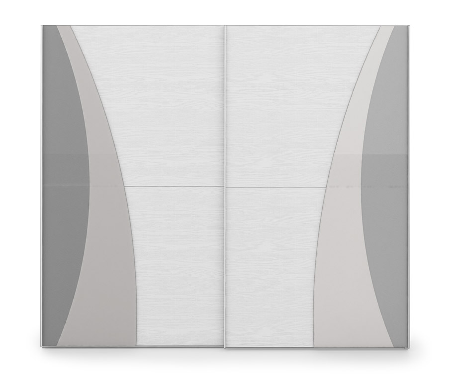 Composta da: armadio 2 ante scorrevole, 2 comodini con due cassetti, comò con quattro cassetti, letto con contenitore e specchiera. Qui presentati in finitura frassino gesso e grigio scuro.