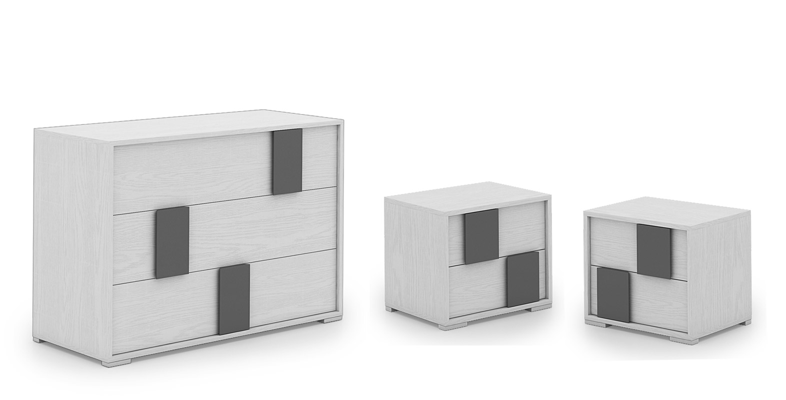Composto da un comò con 3 cassetti e due comodini dotati di 2 cassetti ciascuno.