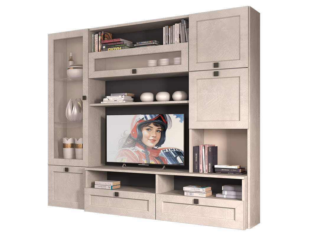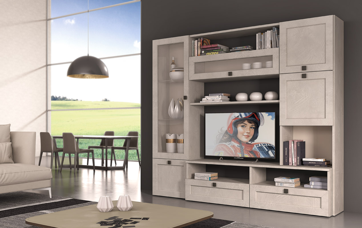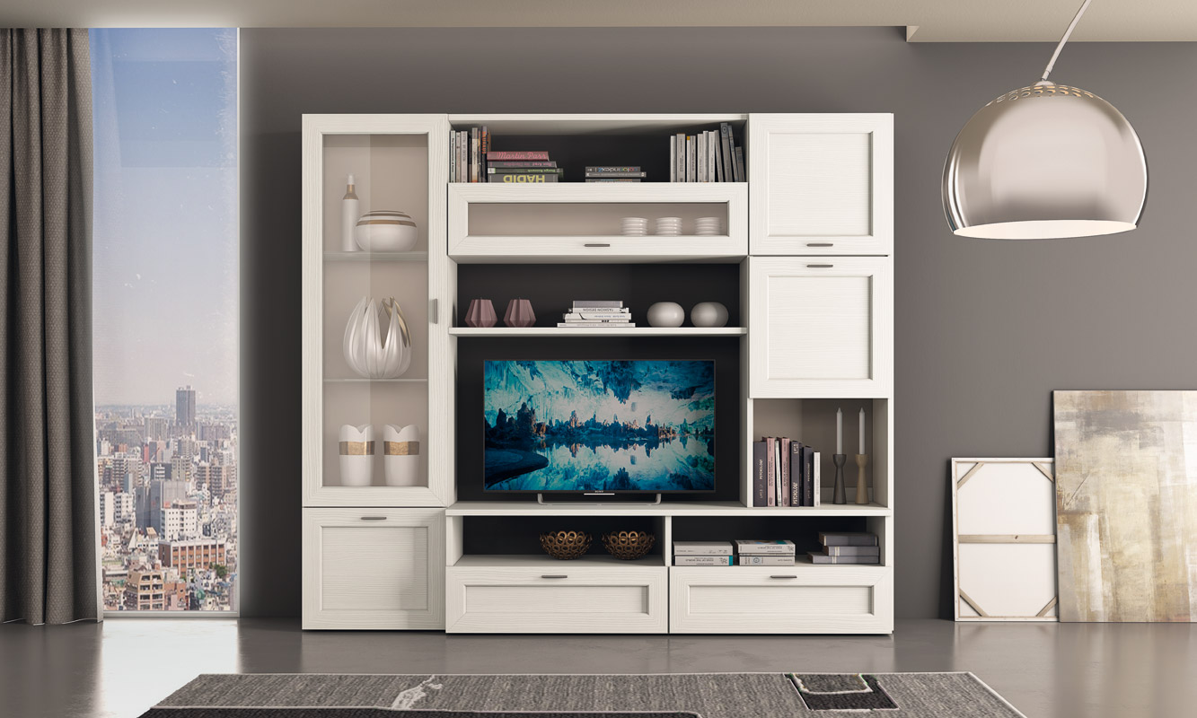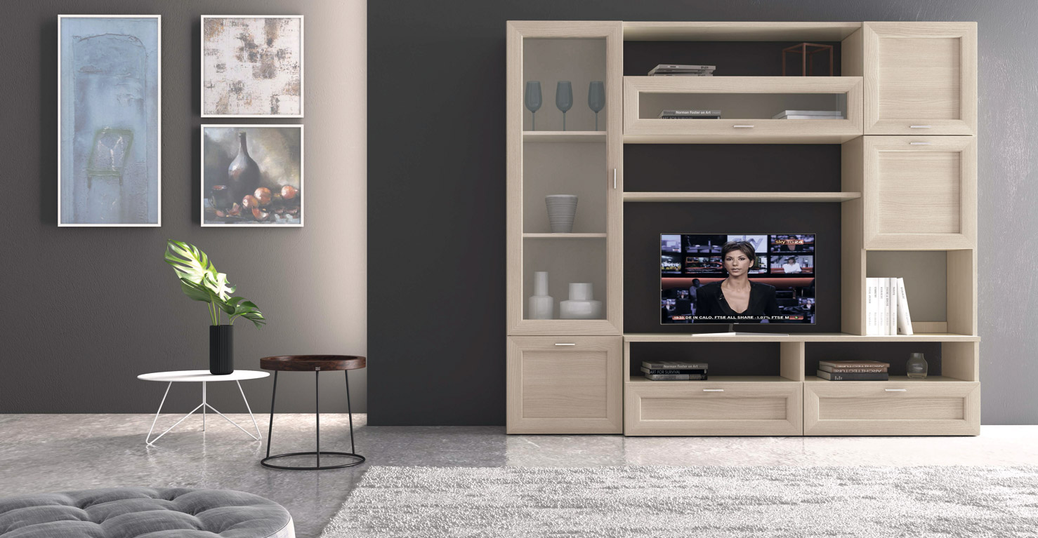 Splendida parete soggiorno dallo stile moderno e dalle linee pulite.