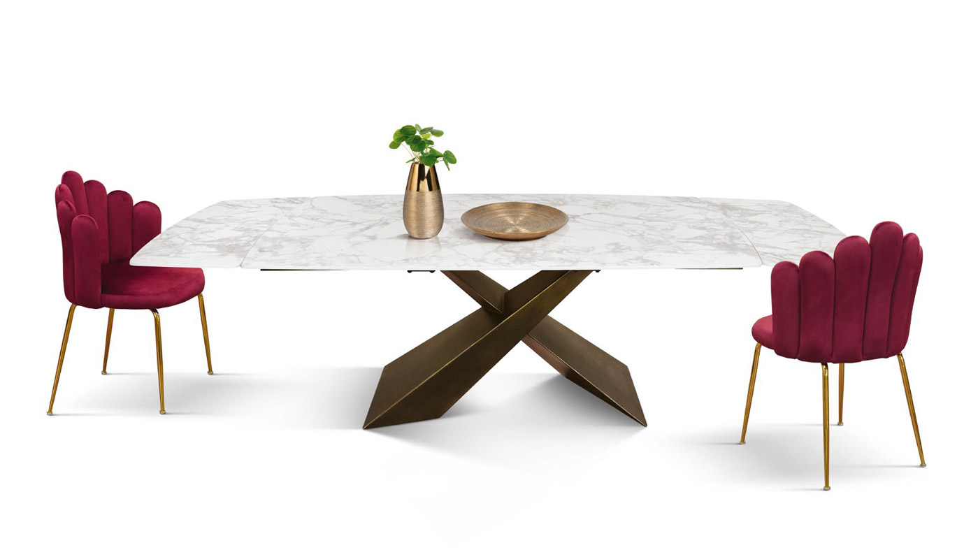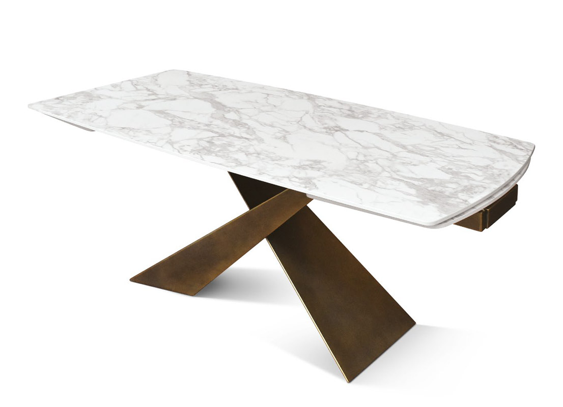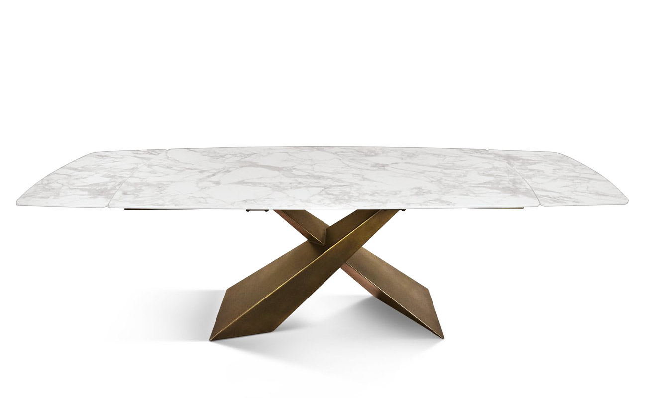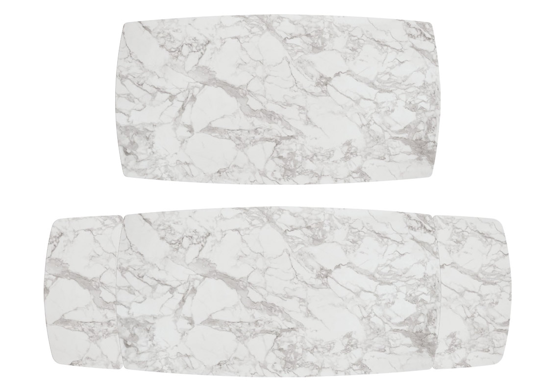 Il piano è realizzato in ceramica con finitura marmo bianco e presenta due allunghe laterali da 40 cm ciascuna.
