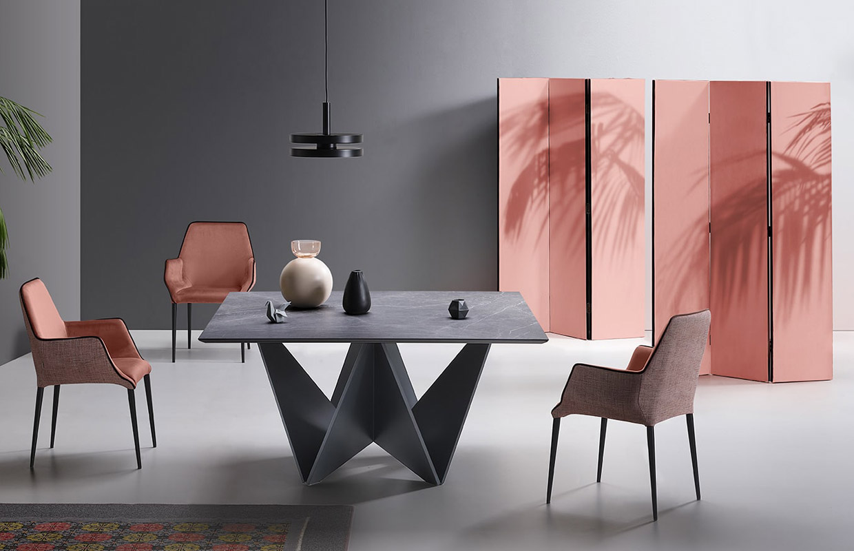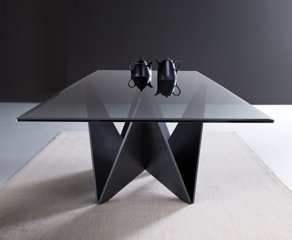 Tavolo quadrato con piano fisso e particolare gambone dallo stile 'origami giapponese'.