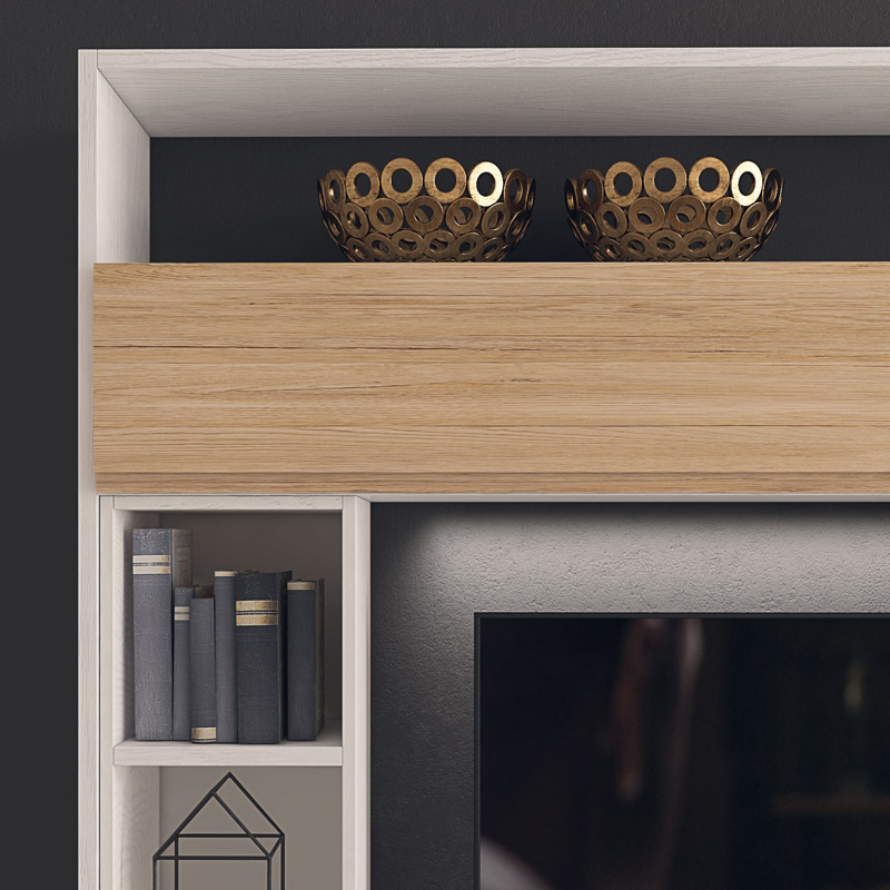 Gli spazzi sono ben suddivisi alternando vani a giorno a vani chiusi da sportelli in finitura quercia con apertura a ribalta.