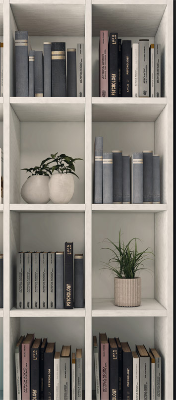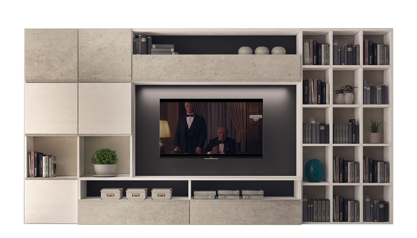 Con i suoi 383 cm , permette di organizzare libri, suppellettili, oggetti personali sia nei pratici vani a giorno della libreria di destra, sia all'interno dei compartimenti racchiusi da ante con chiusura ammortizzata.