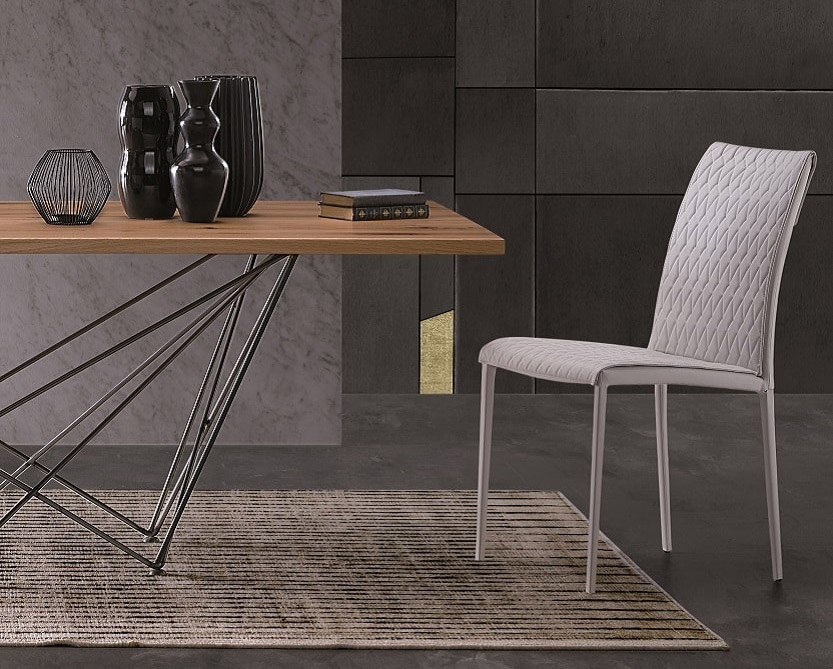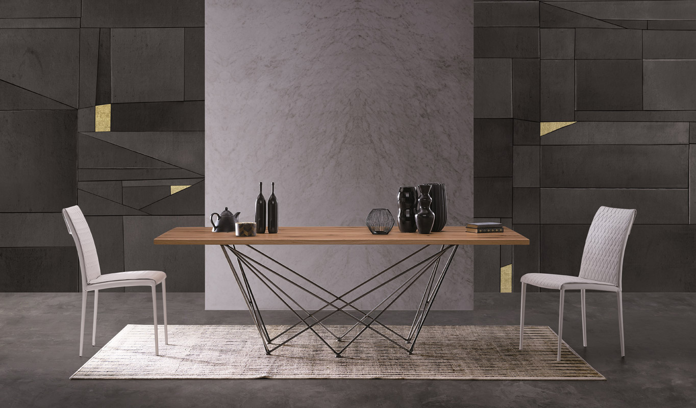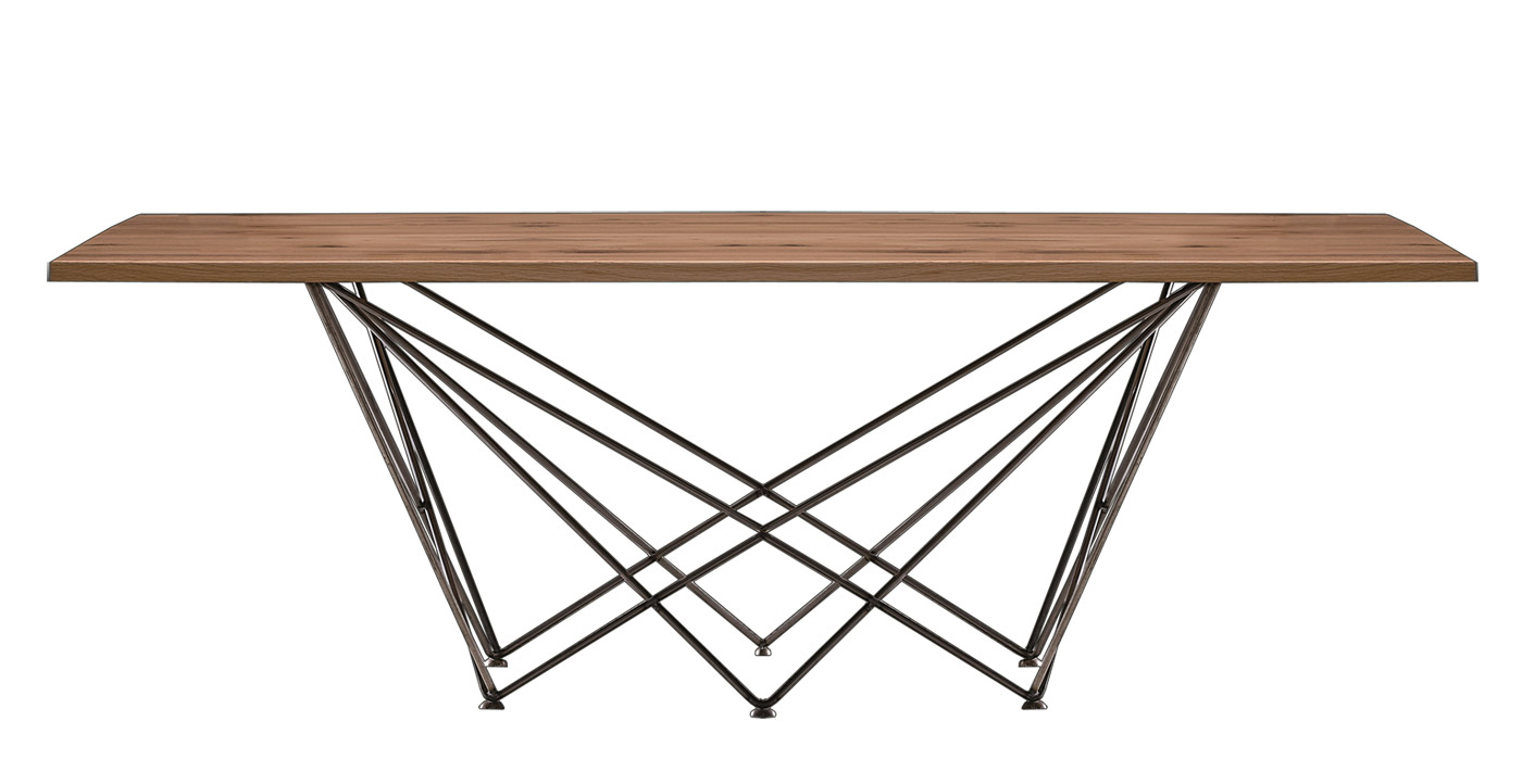 La particolarità di questo tavolo sta nel suo basamento: un intreccio geometrico di tondini