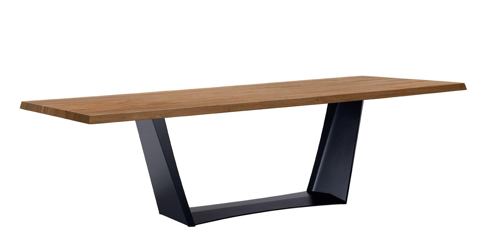 Solido tavolo rettangolare con piano in legno massiccio di rovere e base in metallo.