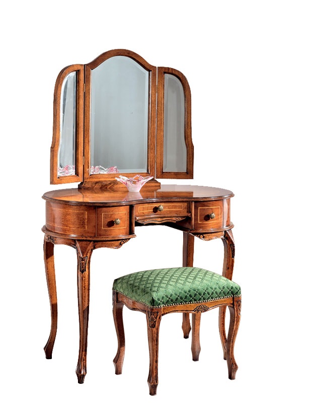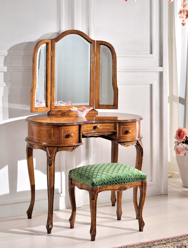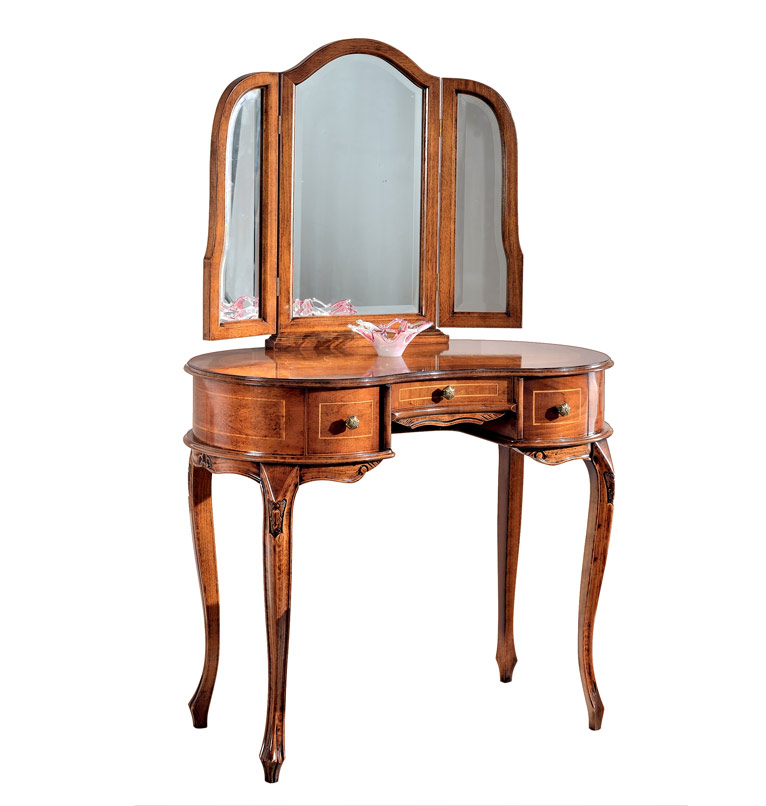 La linea curva caratterizza tutta la composizione a partire dalla forma della specchiera, proseguendo per il piano dello scrittoio e finendo lungo le gambe, sapientemente arricchite da un delicato intaglio, frutto di un lavoro certosino di esperti falegnami veneti.