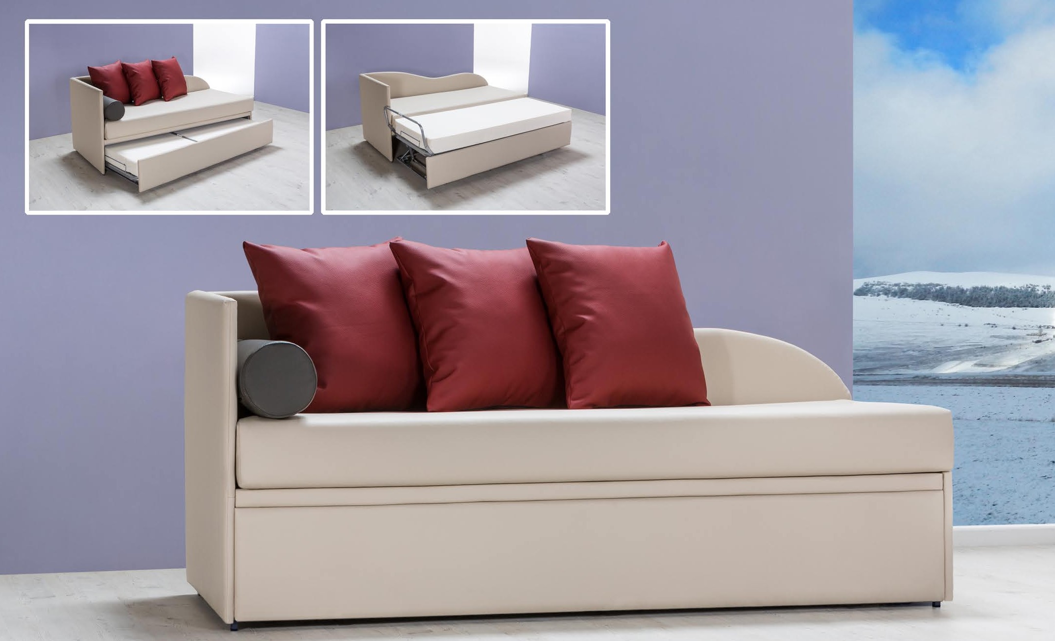 Divano 3 posti sfoderabile, progettato con una struttura in legno resistente e sospensioni a cinghie elastiche ad alta resistenza. La seduta e gli schienali in poliuretano espanso ad alta densità offrono un comfort superiore. Include una rete elettrosaldata e due materassi espansi: materasso superiore 80x190x14 cm e materasso inferiore 75x182x14 cm. Completano il set 3 cuscini e 1 rullo decorativo, come mostrato in foto. Perfetto per chi cerca uno stile elegante e una soluzione pratica per il relax e l'ospitalità!
