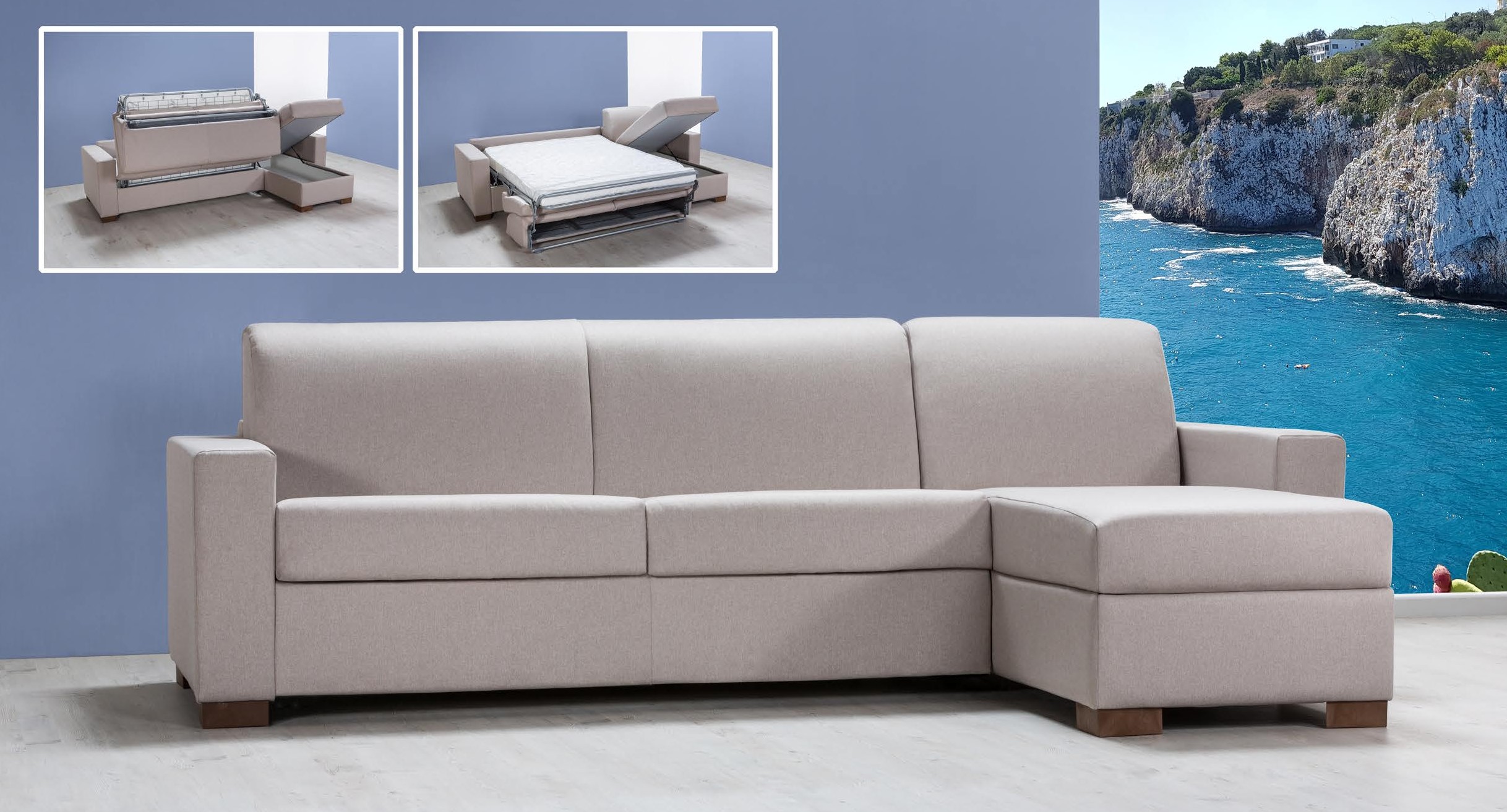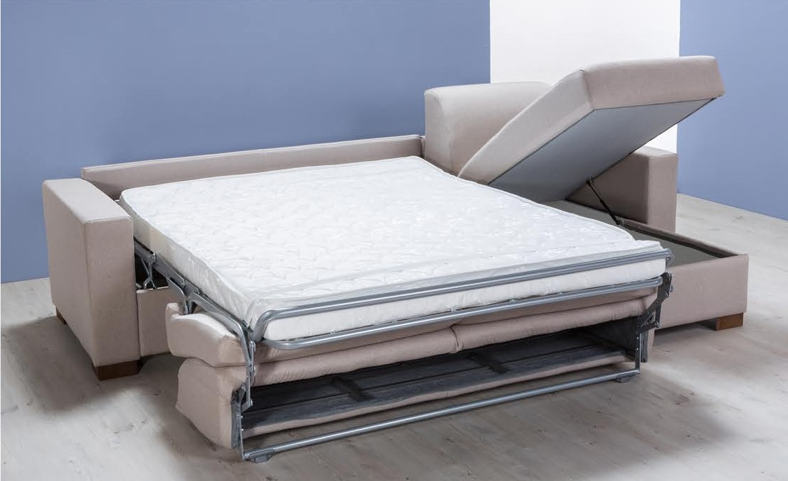 Inoltre, il divano include una rete elettrosaldata e un materasso espanso (160x190 cm, altezza 13 cm), dotato di cavità porta guanciali per maggiore praticità. La presenza della panchetta contenitore aggiunge ulteriore spazio per l'organizzazione e il risparmio di spazio.