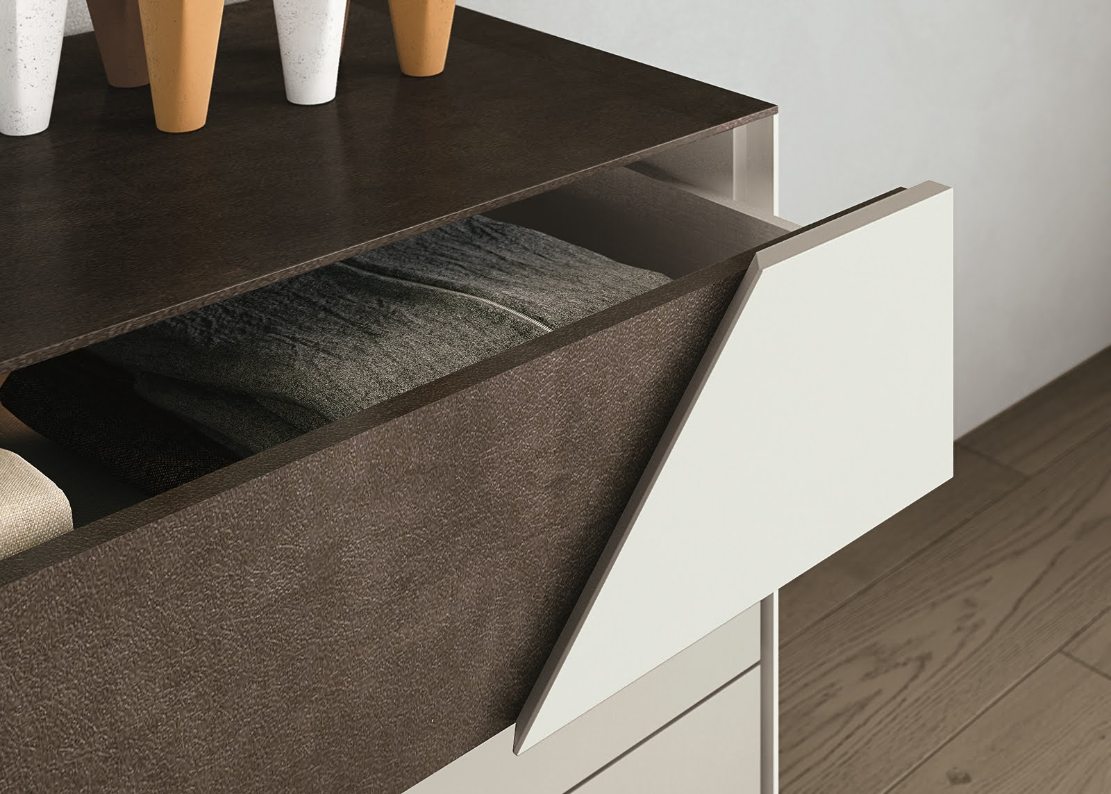 Tre ampi cassetti: la parte centrale della facciata presenta piccoli intagli decorativi, in tono con le preziose maniglie cromate. Un comò capace di coniugare modernità e tradizione che lo rendono un pezzo d’artigianato italiano di alto valore.