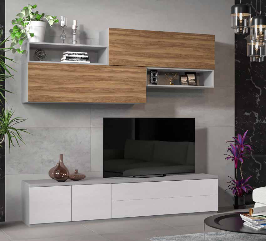 Composto da una base porta tv 2 ante 2 cassetti, con 2 pensili a ribalta e 2 a giorno.
