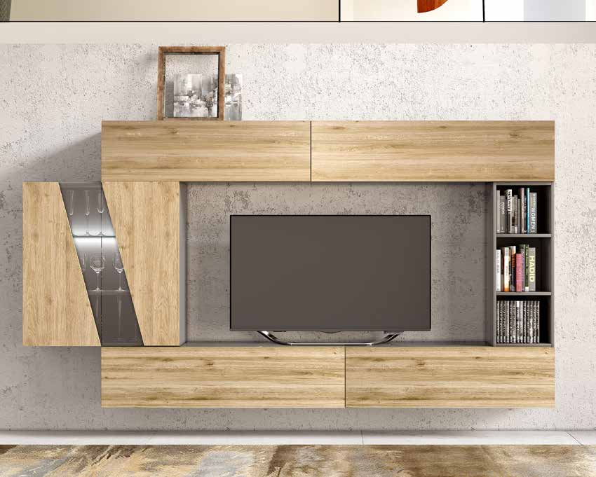 Questo set è composto da una base porta TV con due ampi cassettoni a ribalta, ideale per organizzare i tuoi dispositivi multimediali. I due pensili a ribalta offrono ulteriore spazio contenitivo, mentre la vetrinetta con anta in vetro fumé aggiunge un tocco di eleganza, perfetta per esporre i tuoi oggetti preferiti. La piccola colonna con un'anta e vano a giorno completa l'insieme, offrendo spazio aggiuntivo per libri o decorazioni.