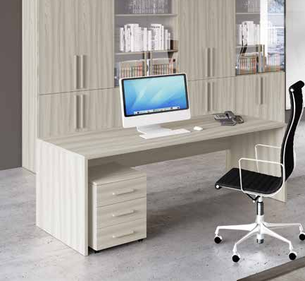 Sotto al piano una cassettiera a 3 ruote, con pratiche maniglie, per riporre gli oggetti di uso quotidiano dell'ufficio che non si vogliono lasciare sul piano della scrivania.
