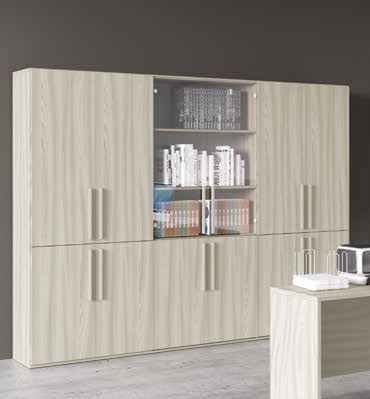 Le ante inferiori raggiungono l'altezza di 85 cm, le ante superiori si prolungano fino a 210 cm, offrendo una grande disponibilità di ripiani per libri, raccoglitori, faldoni, cataloghi, campionature, e documenti vari. Se invece si decide di mettere questo armadio in soggiorno, in corridoio o in lavanderia, è ideale per biancheria domestica, coperte e ad esempio stoviglie, riservando la parte centrale a oggetti che possiamo lasciare a vista.