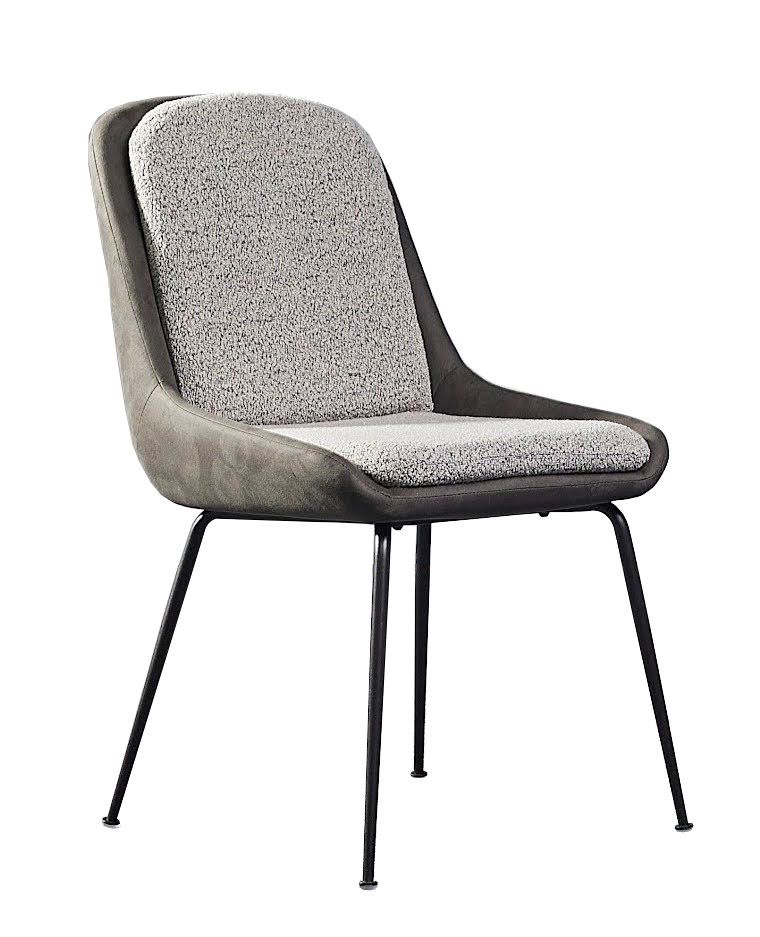 Originale sedia, o poltroncina a seconda di come viene usata, caratterizzata da una struttura avvolgente in ecopelle grigia e una comoda seduta con schienale abbinato in tessuto più chiaro.