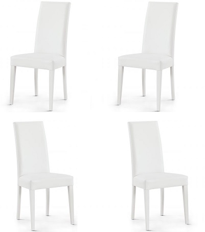 Set di 4 sedie in ecopelle bianca e struttura in legno, anch'essa bianca.