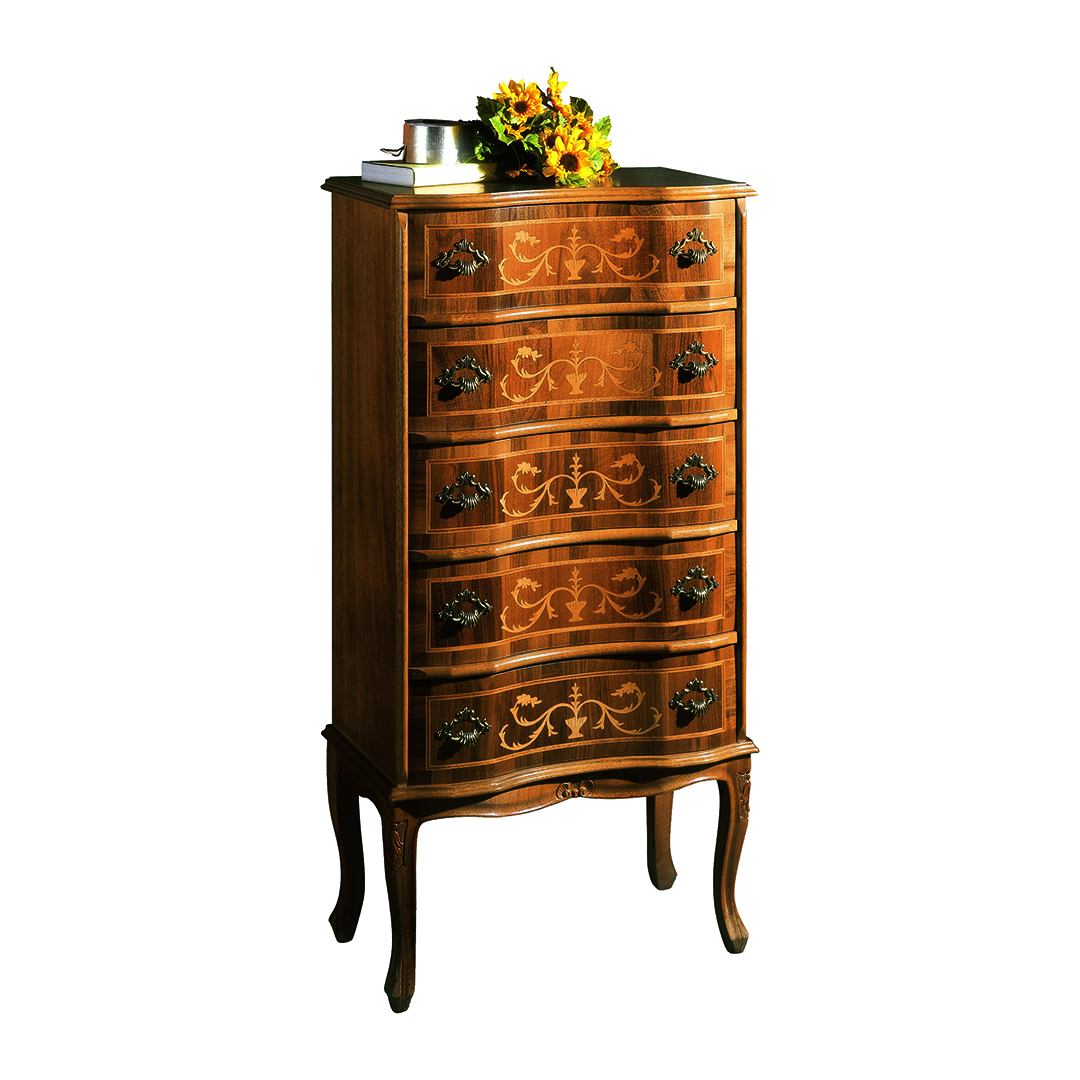 Pregiato comò in legno per la zona notte, raffinato esempio di maestria artigianale.