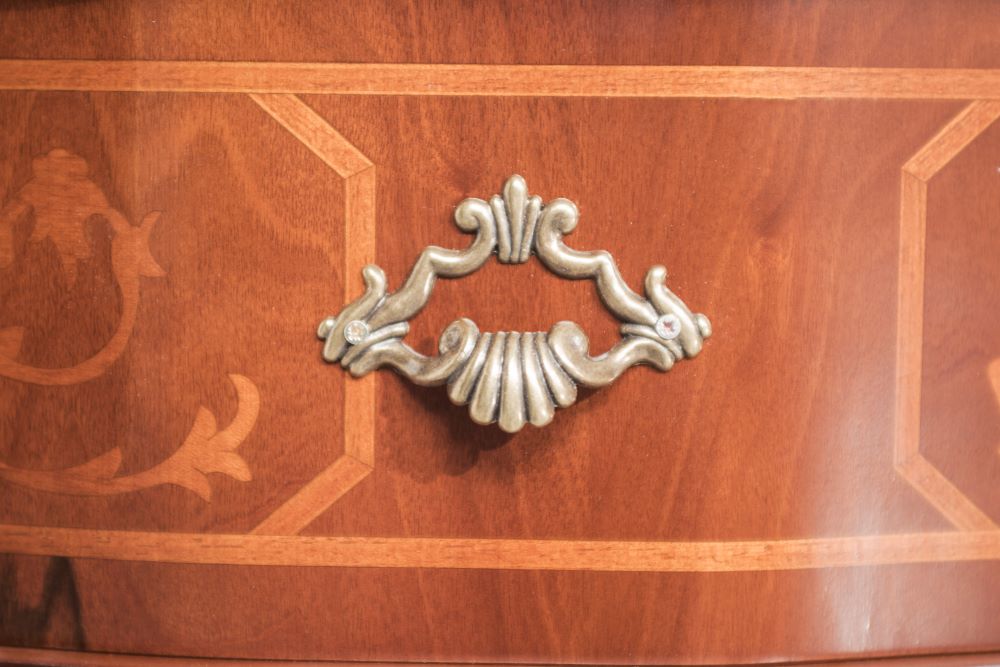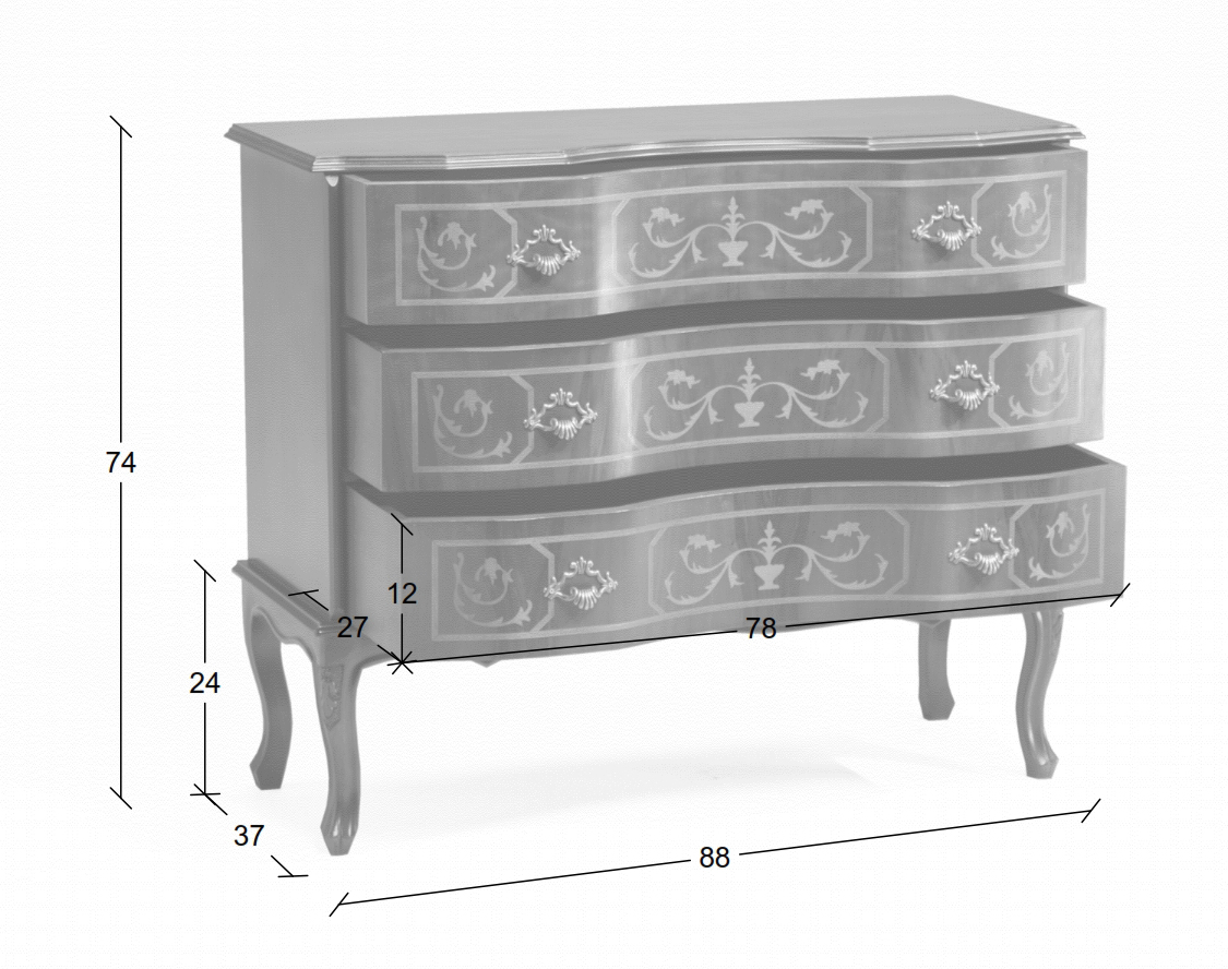 Un bellissimo comò in stile classico che unisci elementi di eleganza, come gli intagli delle gambe e gli intarsi delle facciate, all'utilità di tre capienti cassetti.