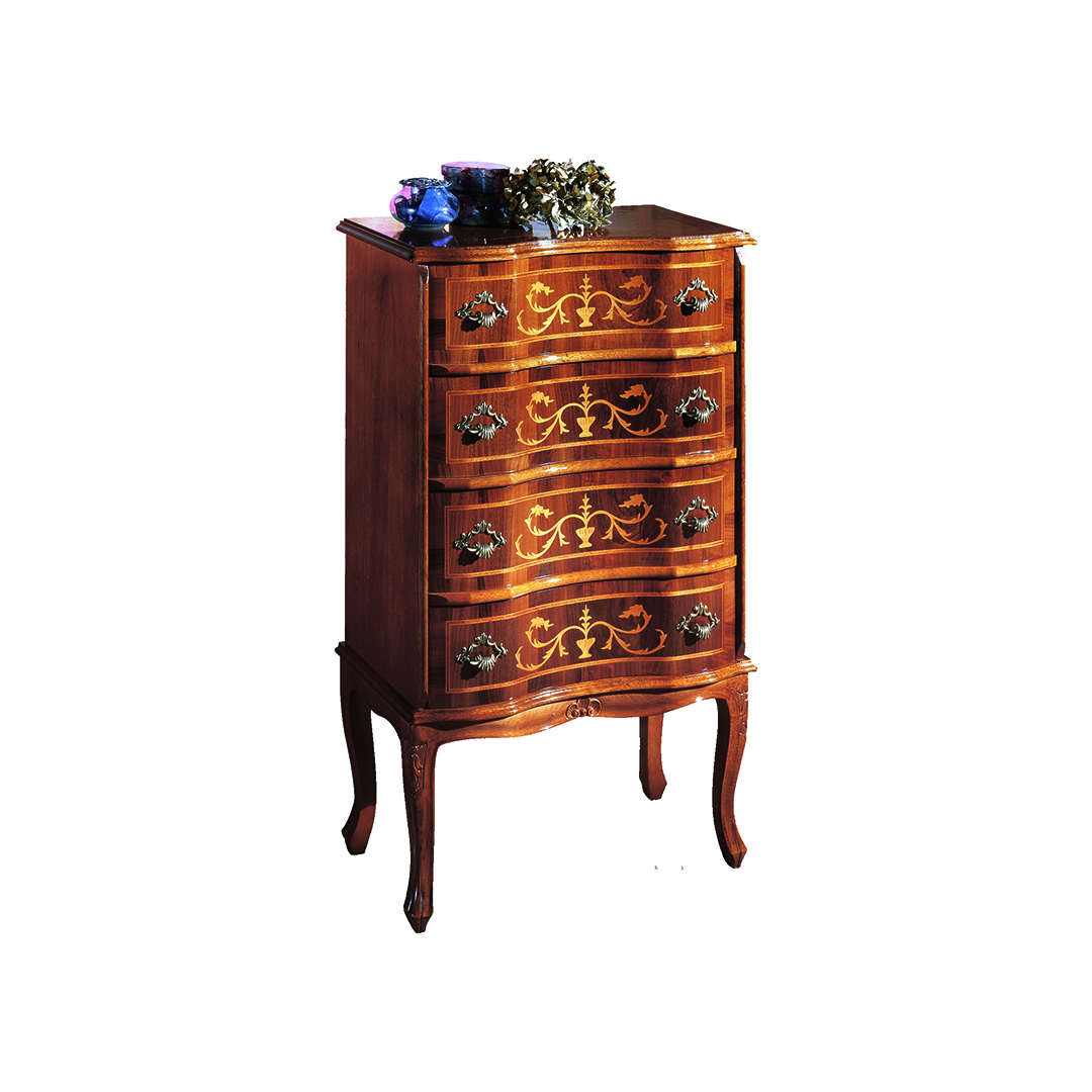 I dettagli intarsiati sui 4 cassetti e intagliati sulle gambe, accompagnati da eleganti maniglie, fanno di questa cassettiera un mobile di grande valore, nonostante le dimensioni contenute.