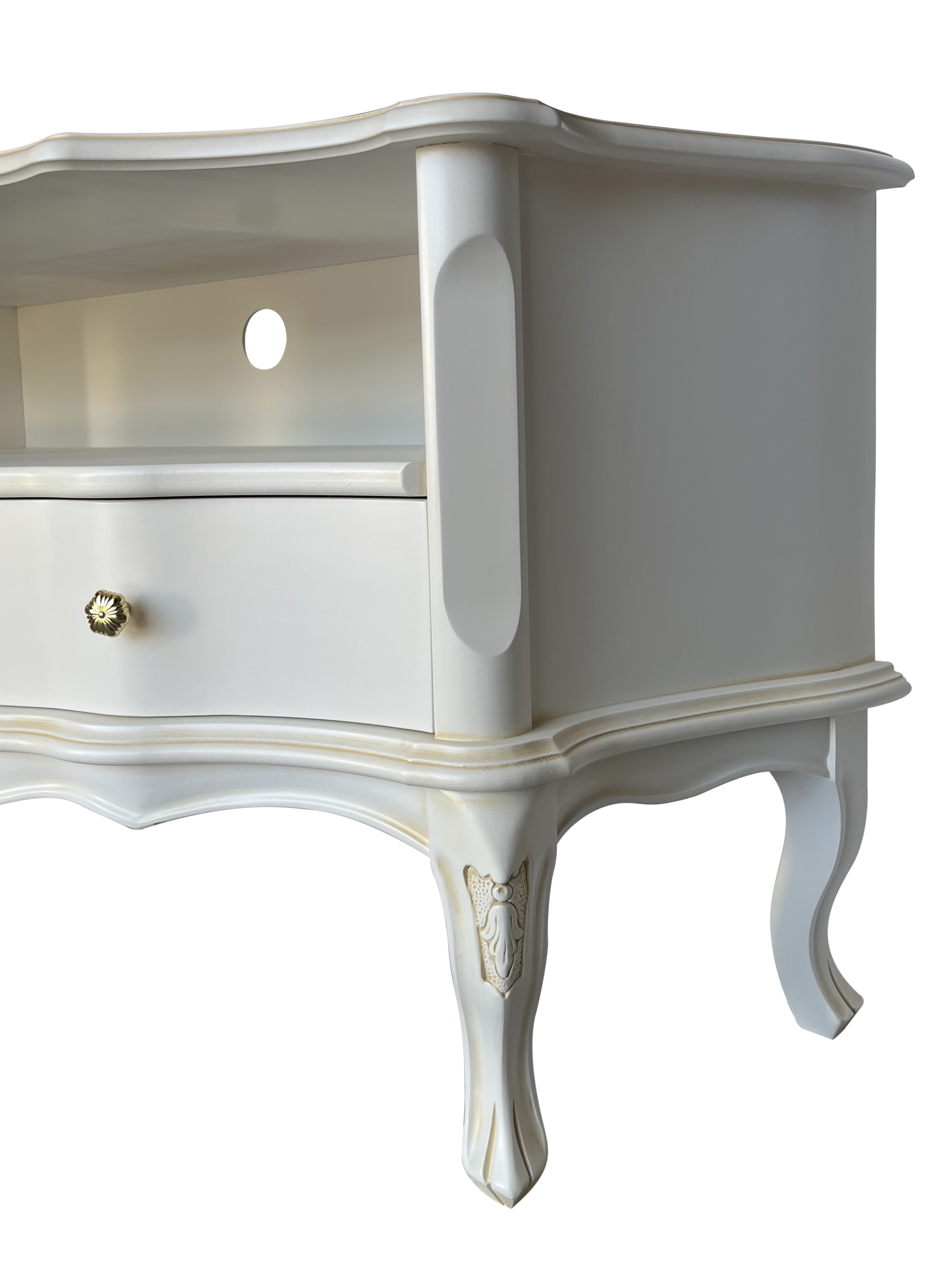 Bellissimo mobile porta tv in stile classico, valorizzato da una bella tinta laccata patinata, per metterne in risalto le linee sinuose.