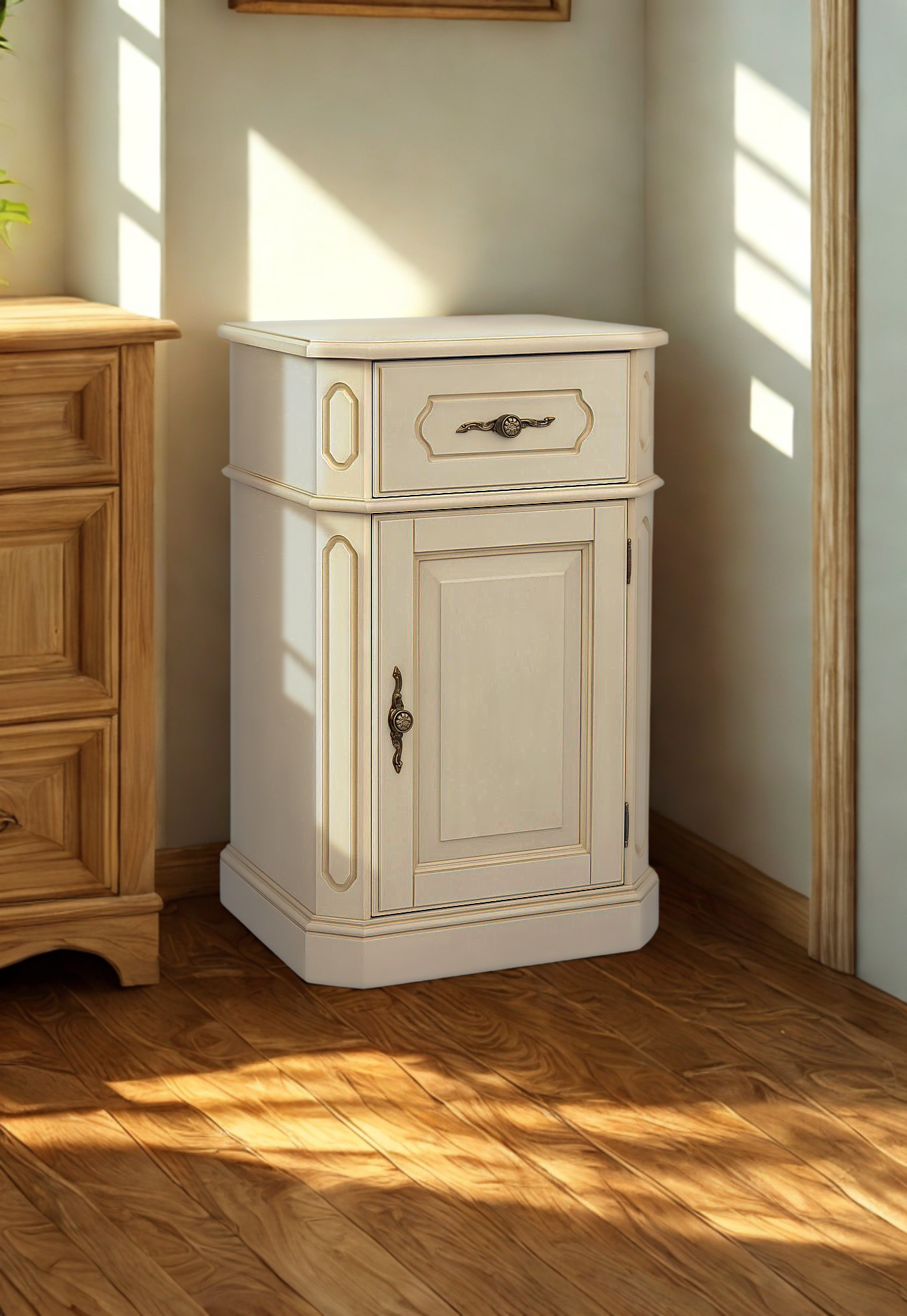 Un comodo cassetto rende questo piccolo mobile un elemento d'arredo completo e versatile, posizionabile in ogni angolo o contesto della casa.