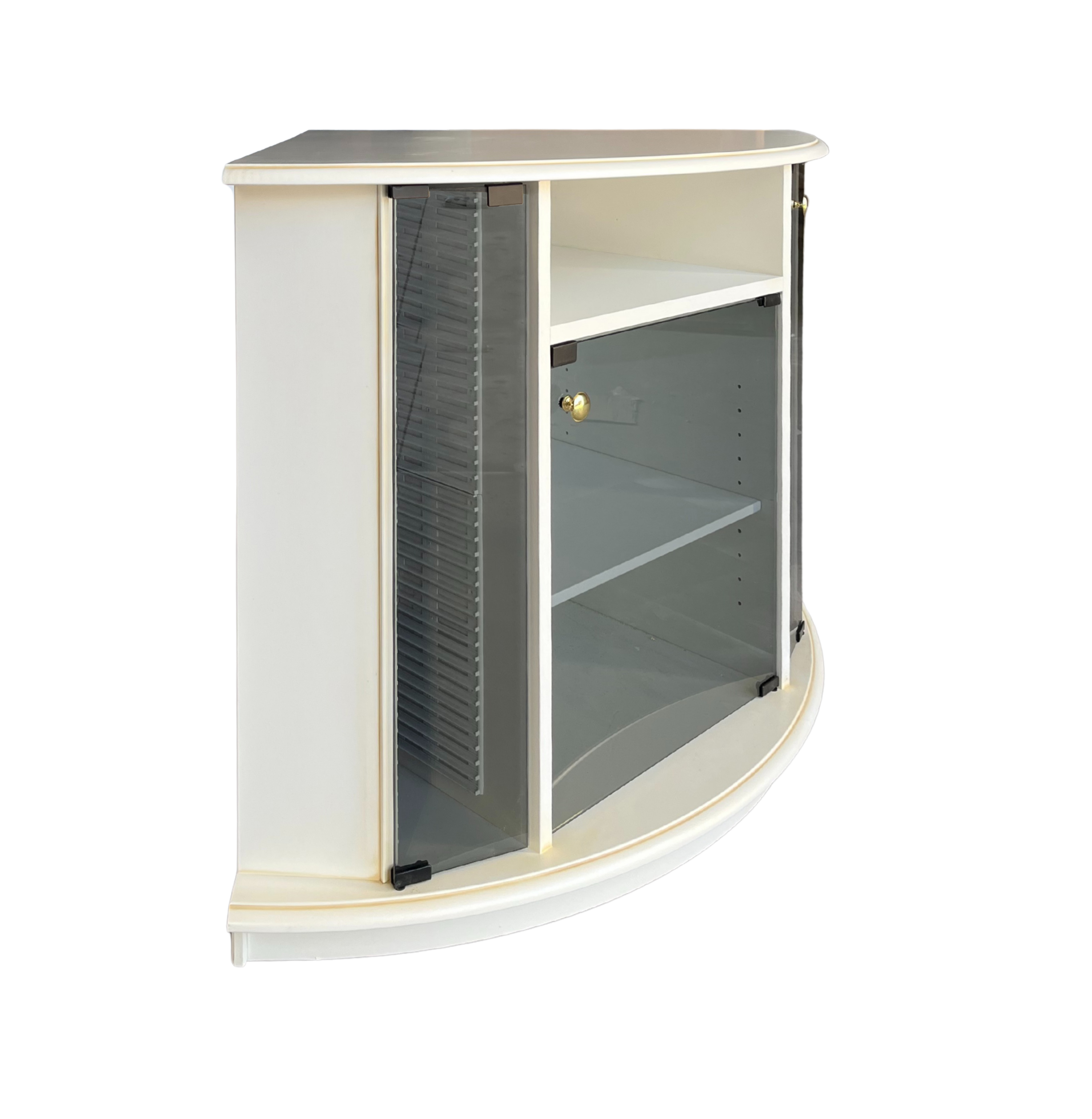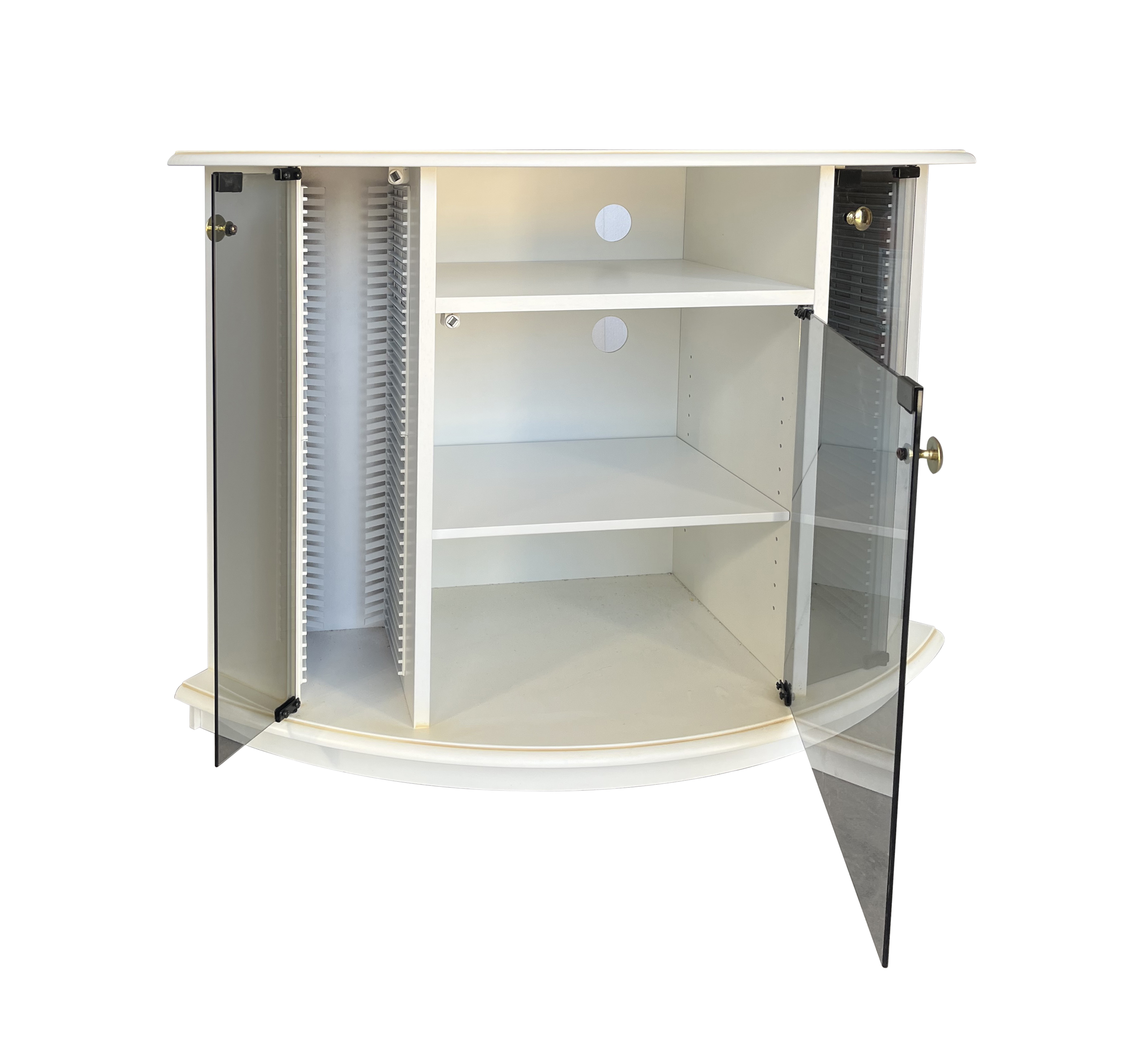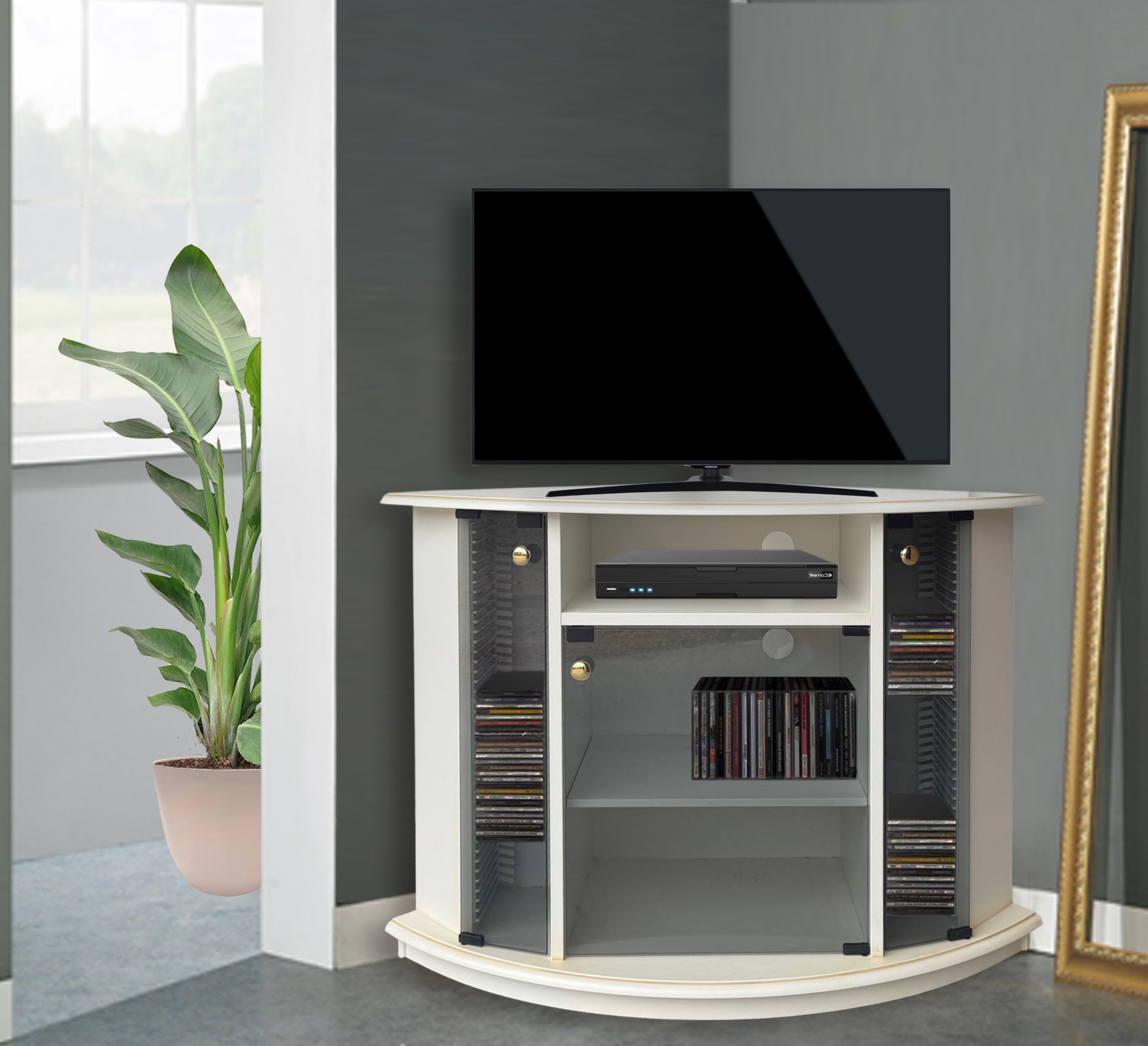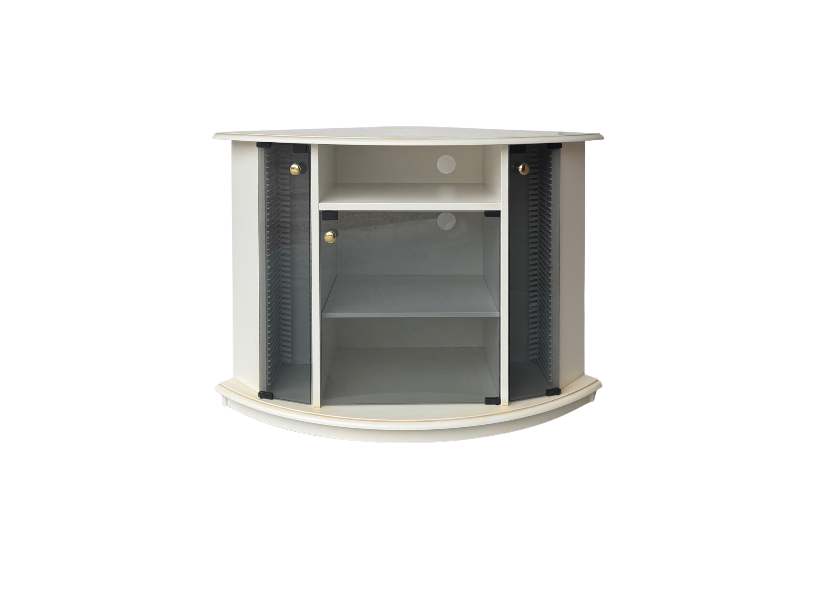 Bellissimo ed originale mobile porta tv ad angolo, caratterizzato lateralmente da 2 vani sviluppati in altezza con griglia porta CD (da 40 CD cadauna). Centralmente un vano a giorno sotto il top e un vano chiuso da anta a vetro, dotato di ripiano e foro passacavi.