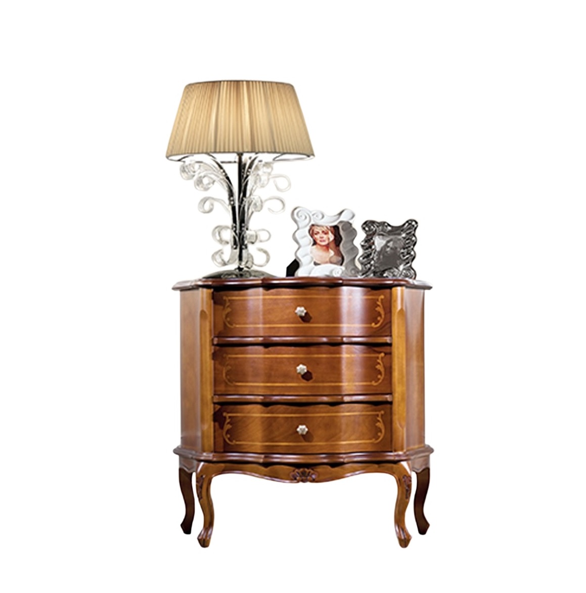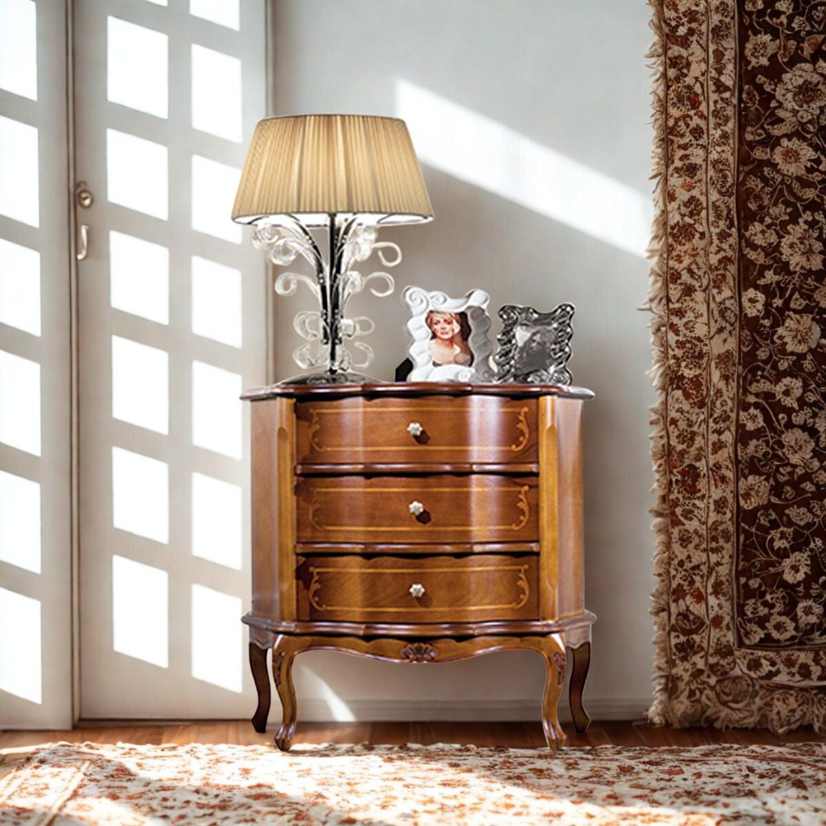 Comodino Luigi Filippo con 4 comodi cassetti. La classica linea di questo stile ben si adatta ad un mobile che ottimizza tutto il volume occupato.