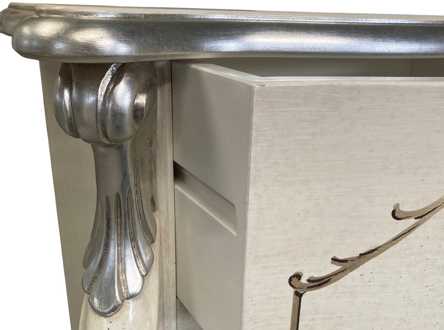 Poi, scendendo, apprezzi la particolare sagoma dell'anta che, ripresa la curva della parte superiore, scende lasciando ampia visibilità all'interno, impreziosito da ripiani in legno o cristallo, dal fondo in tinta o tappezzato con splendido, ma allo stesso tempo discreto, tessuto.