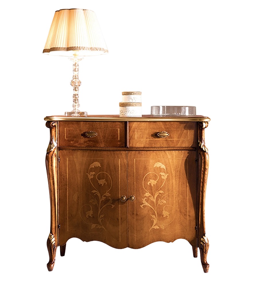 Una bella credenzina sagomata, con un delicato intarsio su ante e cassetti e pregiati elementi intagliati su spalle e piedini, sapientemente messi in risalto dalla foglia oro, ripresa poi sul top del piano e richiamata dalla bella maniglieria.
