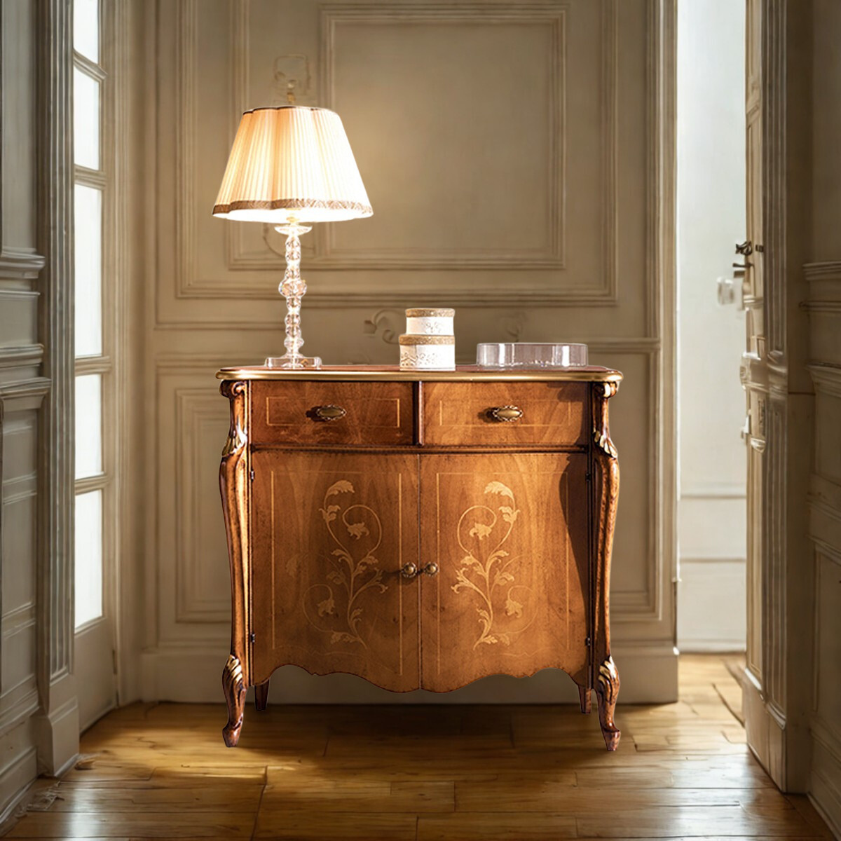 Credenza con 2 porte e 2 cassetti di grande stile e personalità, racchiuse in 107 cm di larghezza e quindi adatta anche agli ambienti più contenuti ma che hanno bisogno di un tocco di classe.