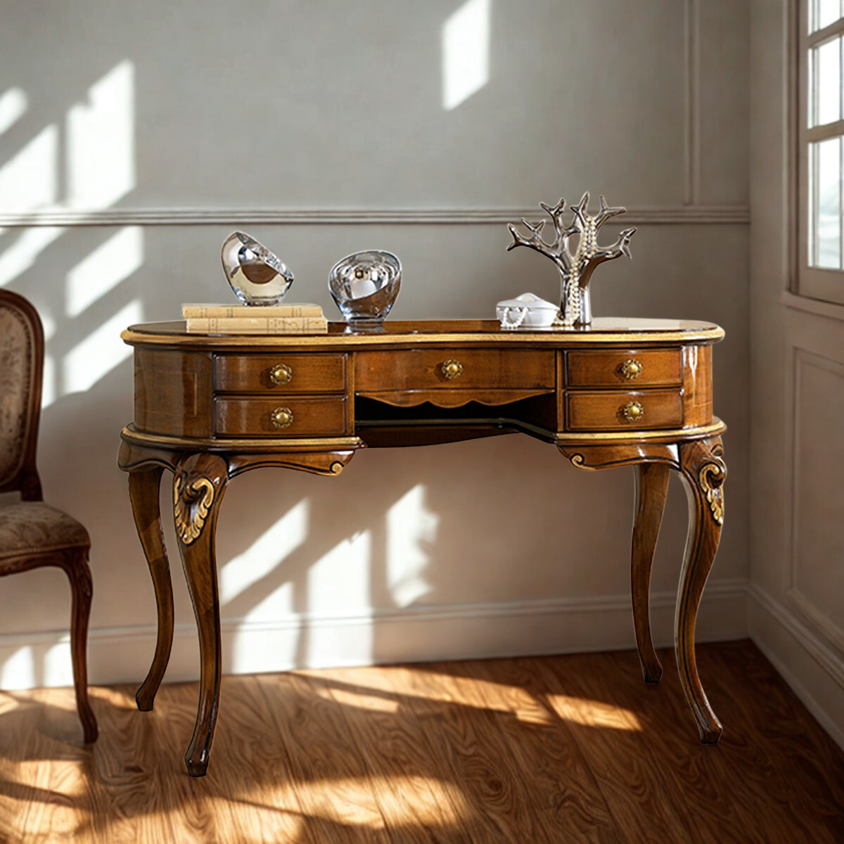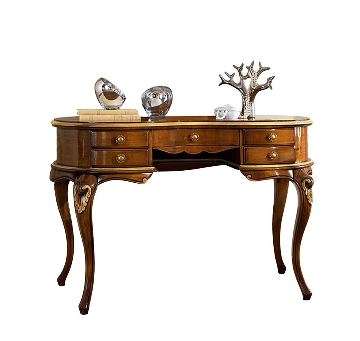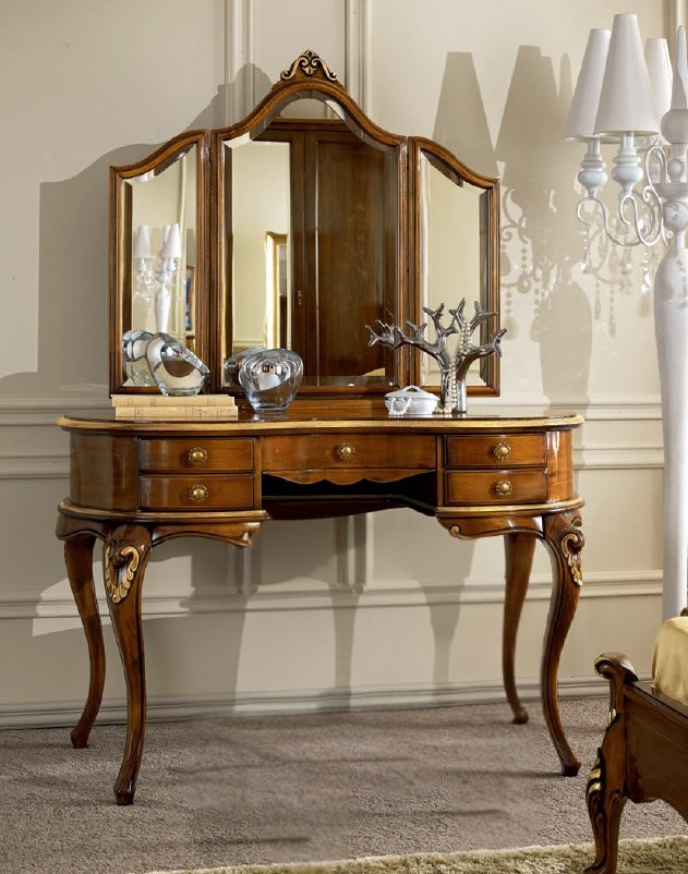 La linea curva caratterizza tutta la composizione a partire dalla forma della specchiera, proseguendo per il piano dello scrittoio e finendo lungo le gambe, sapientemente arricchite da un delicato intaglio, frutto di un lavoro certosino di esperti falegnami veneti.