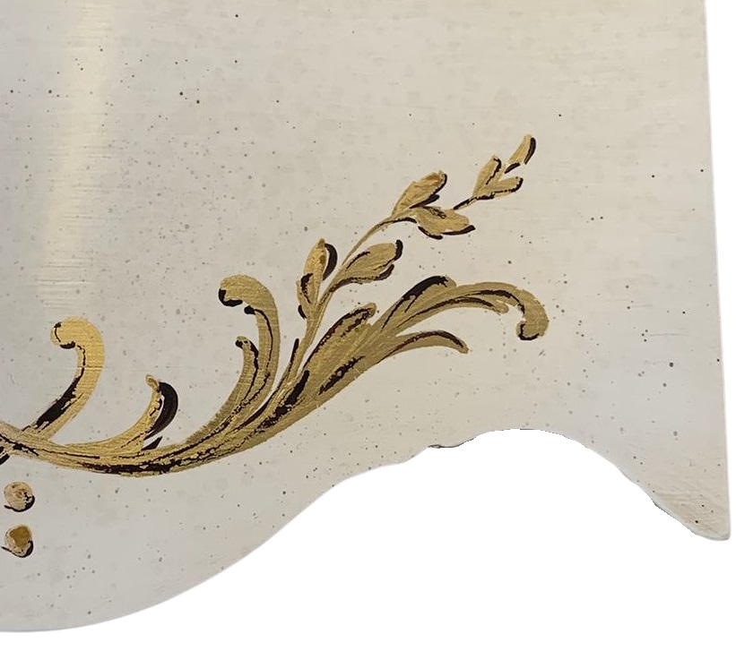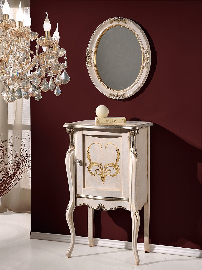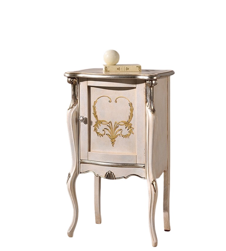 Un mobiletto originale sia nella forma che nella finitura. Lo stile classico è messo in risalto dalle linee sinuose e dai dettagli intagliati, decorati con elegante foglia argento, alla quale viene accostata la foglia oro del decoro fatto a mano.